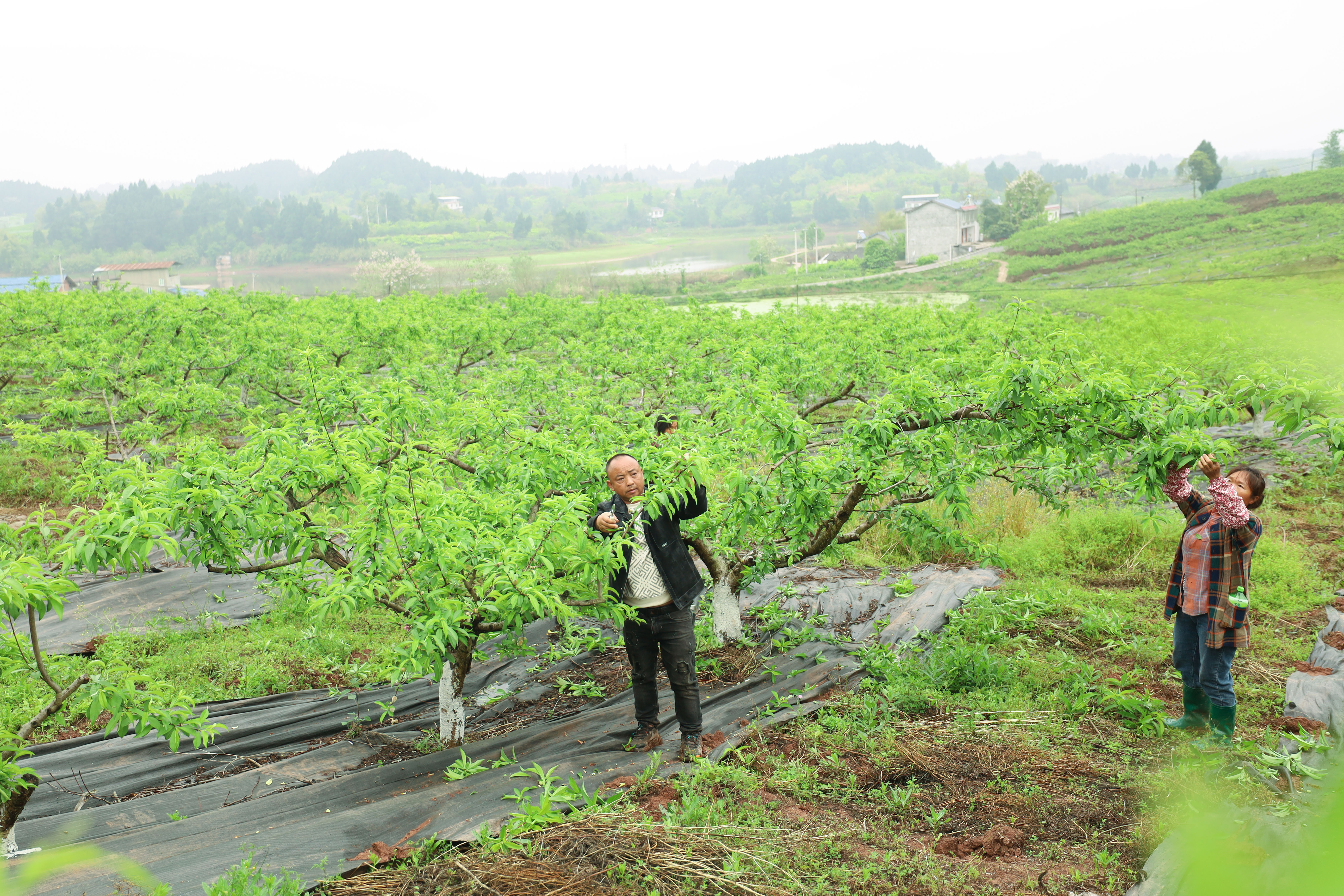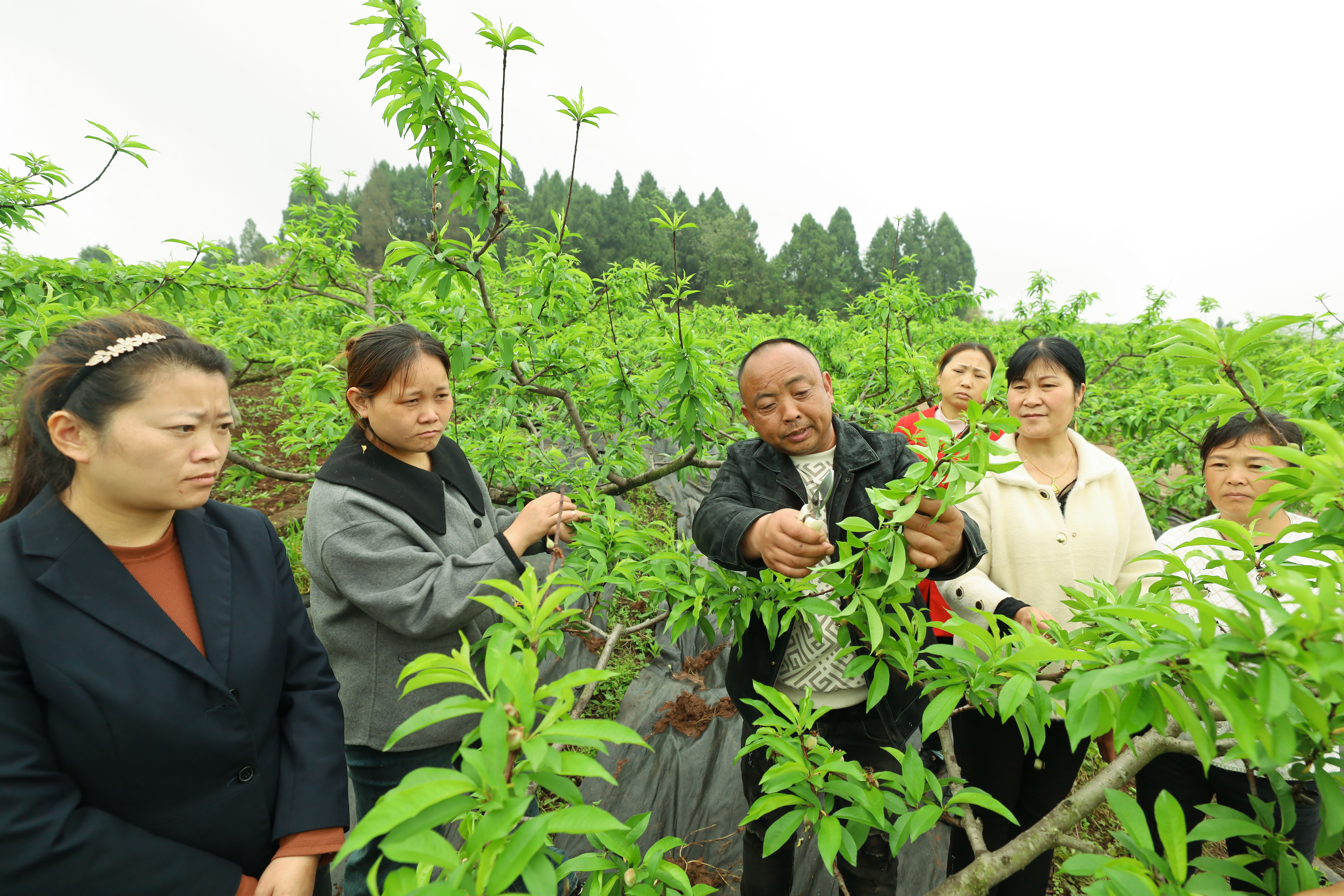 “疏果要去除两边,留中间,尽量留侧果,这样长出来的果子品质才高。”4月9日,在拦江镇五琅坝村莲湖脆桃产业基地,技术管理员潘健正指导10余名村民进行修枝疏果。