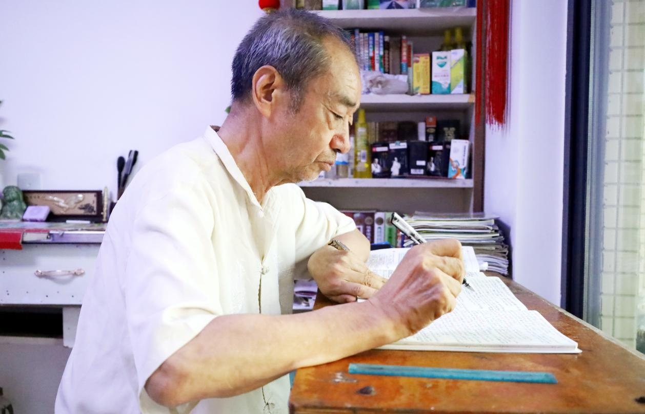见记者进门,吴明龙才放下手中的笔,笑着招呼大家入座:“我的邻居小朋友们英语有点差,放了暑假要来我家补课,空闲时我就在做准备。”今年77岁的吴明龙有着50年党龄,他说:“作为党员,要为人民服务,就算退休了也要发挥作用。”