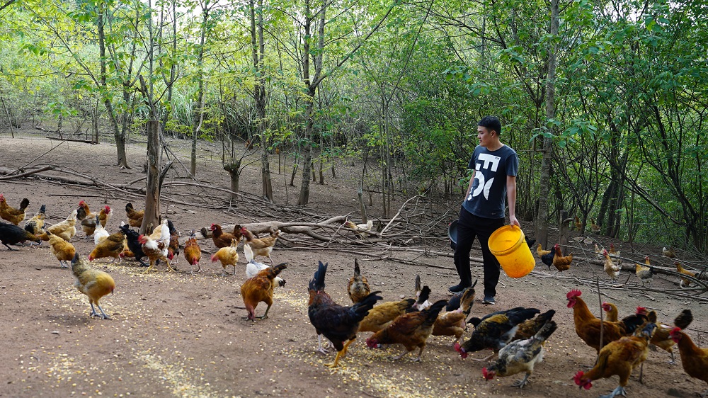 “每天早上放出去,到了晚上它们就会自己回棚里休息。平时喂些玉米、谷粒等谷物杂粮,饿了就逮虫子、吃树叶。”自强跑山鸡养殖专业合作社负责人余强提着装有玉米碴的小桶站在坡上,一边和记者闲聊,一边准备喂鸡。鸡群一看到余强便飞奔而来,争先恐后地围拢啄食。