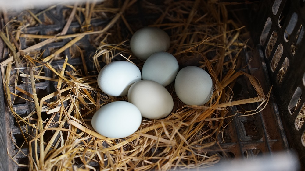 “目前有1000多只绿壳蛋鸡,每天能捡上百个绿壳蛋。”喂完鸡后,余强转身扎进鸡棚内开始捡拾鸡蛋,“绿壳蛋鸡的运动量大、脂肪少,肉质紧实、味香鲜美,食客反响不错。绿壳鸡蛋胆固醇含量低,蛋白质、氨基酸等含量较高,也深受市场欢迎。”