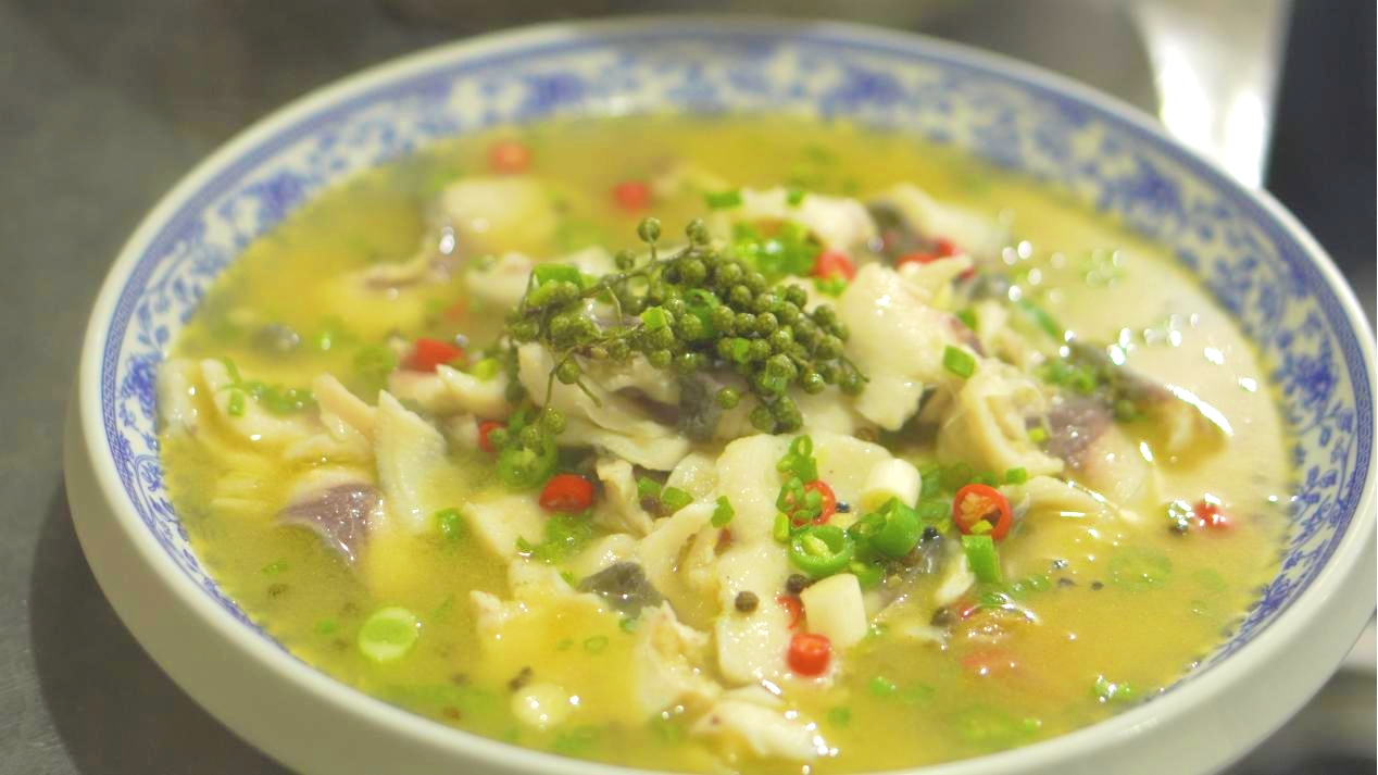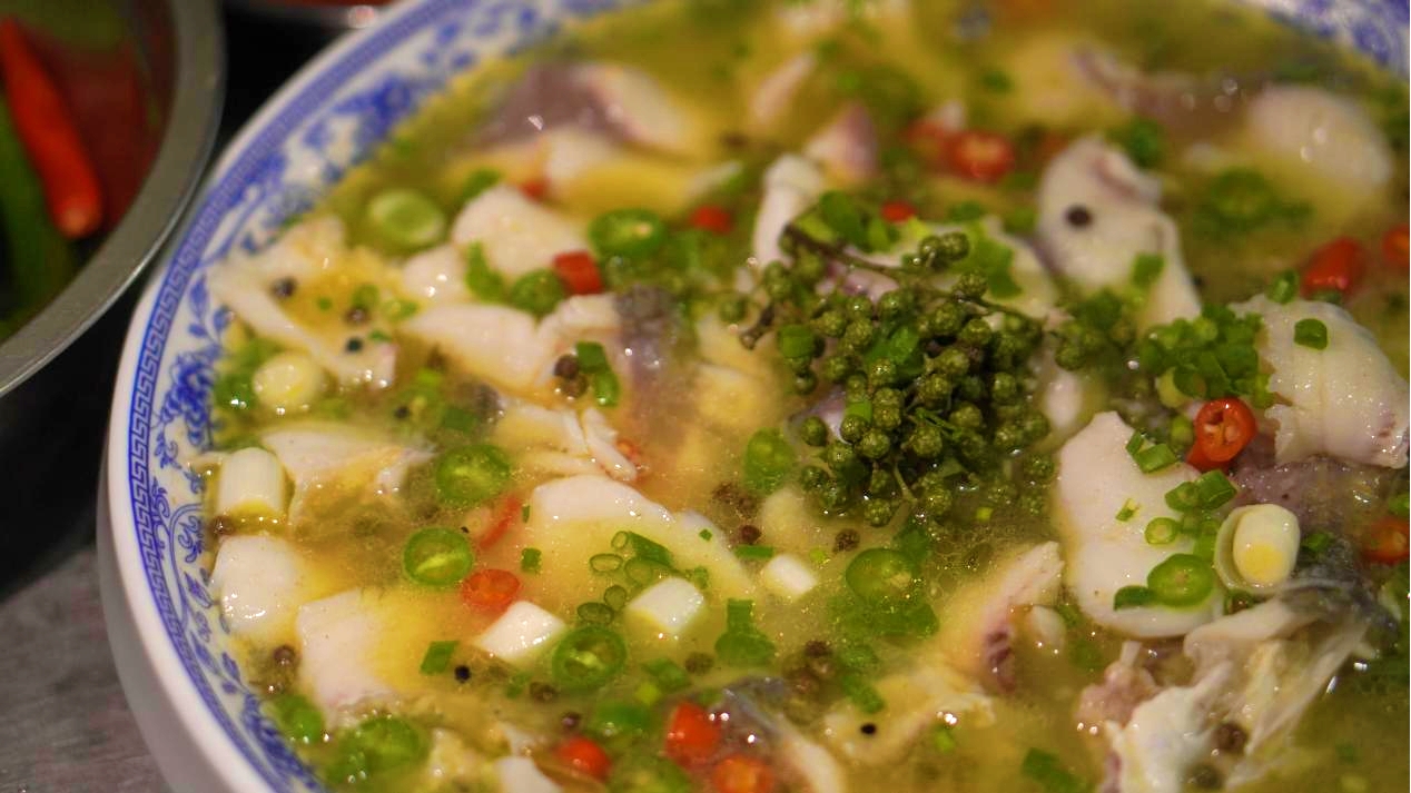 酸菜坛启封的脆响是开战的号角,鱼骨与农家酸菜在铁锅里滚出雪浪,青花椒趁势点燃麻香的烽火。汤色渐浓时,鱼片如蝉翼轻落沸汤,勺背一推一送间,莹白肉片在酸辣汪洋中舒展成云。最后一把鲜椒与青花椒撒下,雾气蒸腾中,整座山庄都成了酸麻鲜香的俘虏。