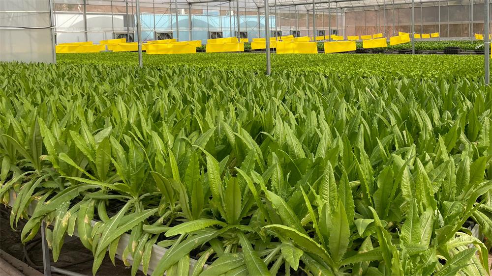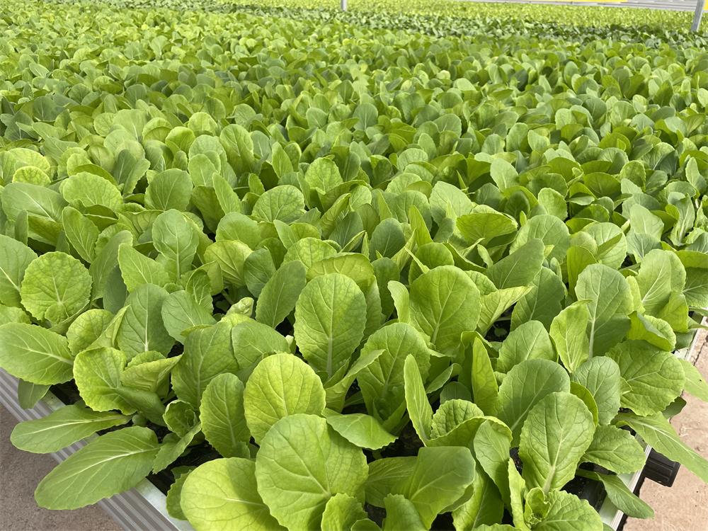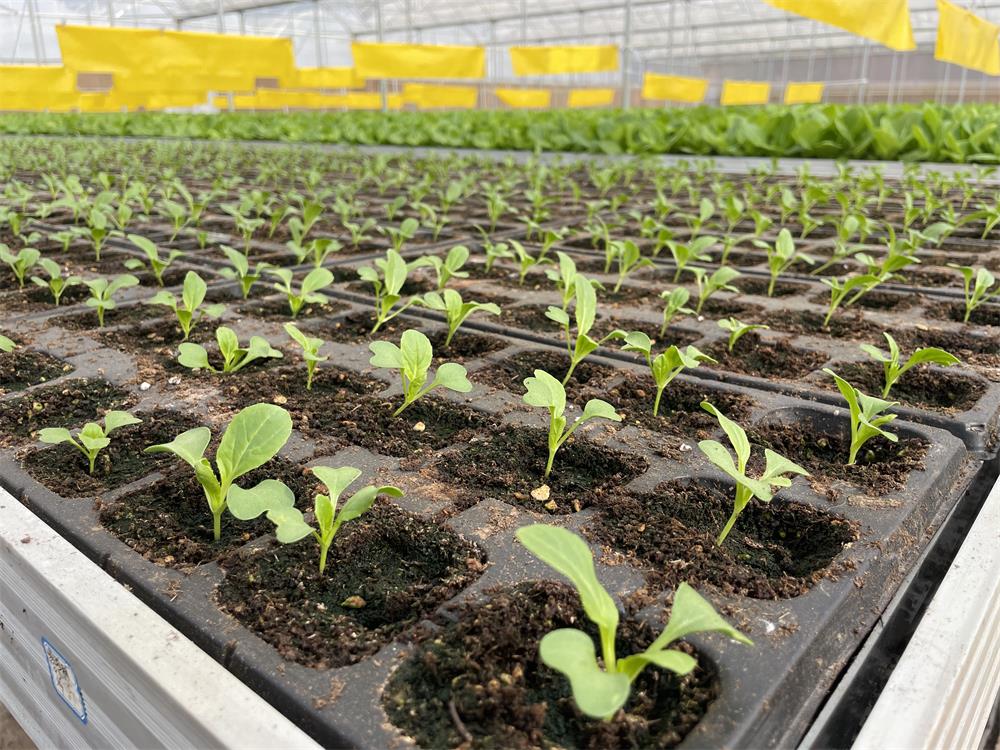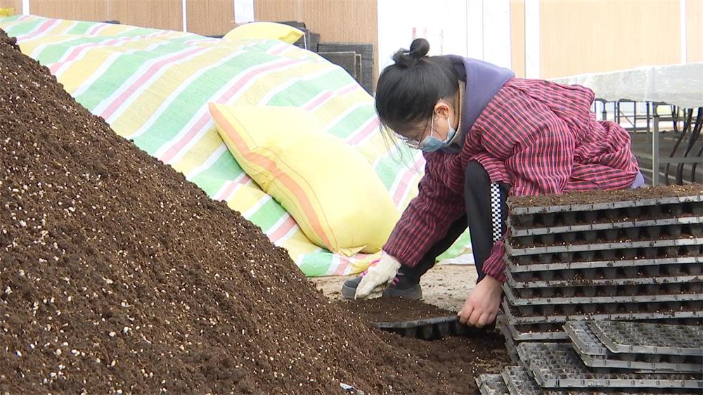在蔬菜大棚内,几名工人有序分工,忙着苗盘装填营养基质、苗穴播种、覆盖基质等,各项工作井然有序地进行,为今年的蔬菜产业发展做准备。放眼望去,大棚内嫩绿青翠欲滴,绿油油的菜苗格外诱人,向人们传递着“春”的气息,也预示着新年的好收成。