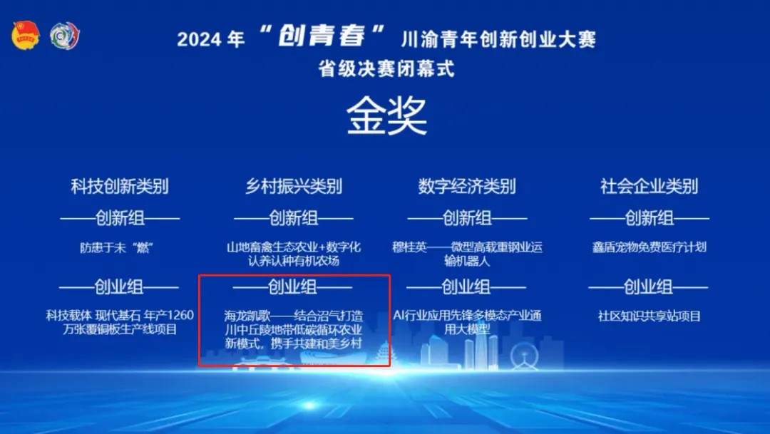各参赛选手经过“路演+问答”的激烈角逐,最终评选出8个金奖、16个银奖和23个铜奖,遂宁青年荣获3金2银的历史最好成绩!其中安居区“海龙凯歌—结合沼气打造川中丘陵地带低碳循环农业新模式,携手共建和美乡村”项目荣获乡村振兴类别创业组金奖!