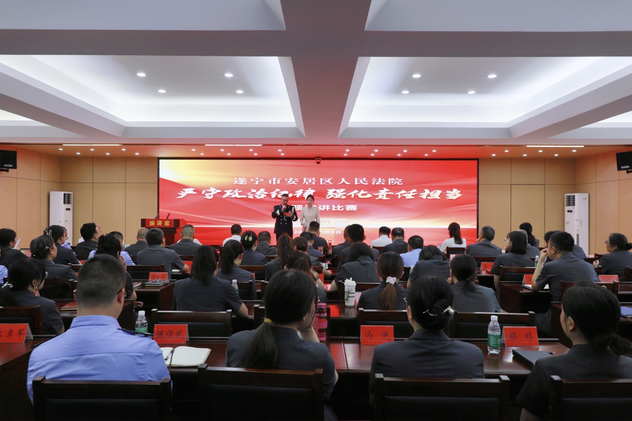 “法官是法律的执行者,是公平正义的守护者……”为进一步提升法院干警的政治素养和责任意识,激发干事创业的工作热情,9月9日,安居区人民法院开展“严守政治纪律 强化责任担当”演讲比赛活动,旨在推动安居区人民法院“讲政治、优作风、拼质效”专项行动走深走实。