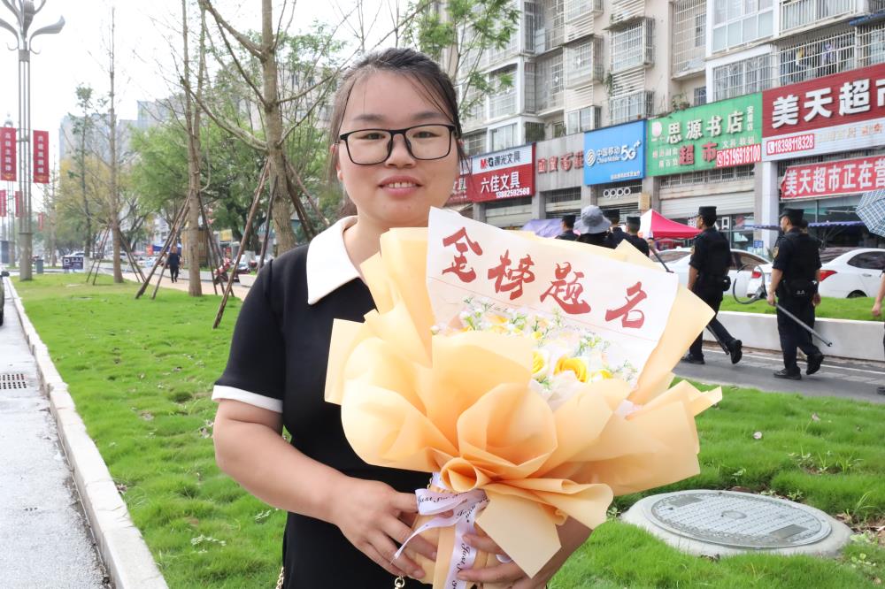 一大早,37岁的市民刘女士就抱着自己亲手制作的“金榜题名”花束,来到了考点外等候,“我儿子快满18了,今年高考的目标是师范大学,我觉得他没问题,等他明天考完出来,准备就把这束花送给他。”