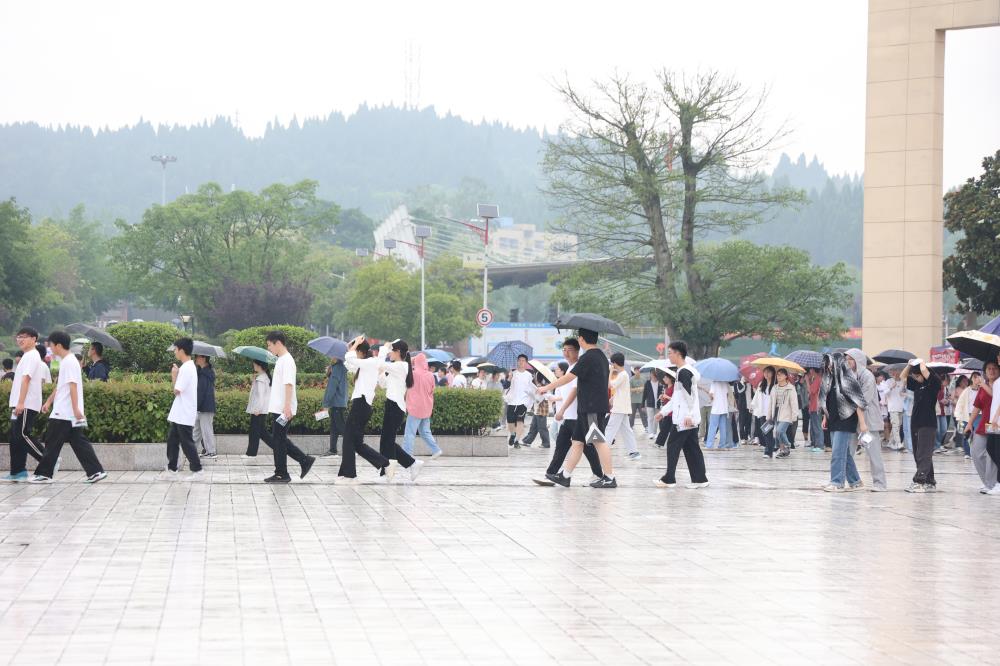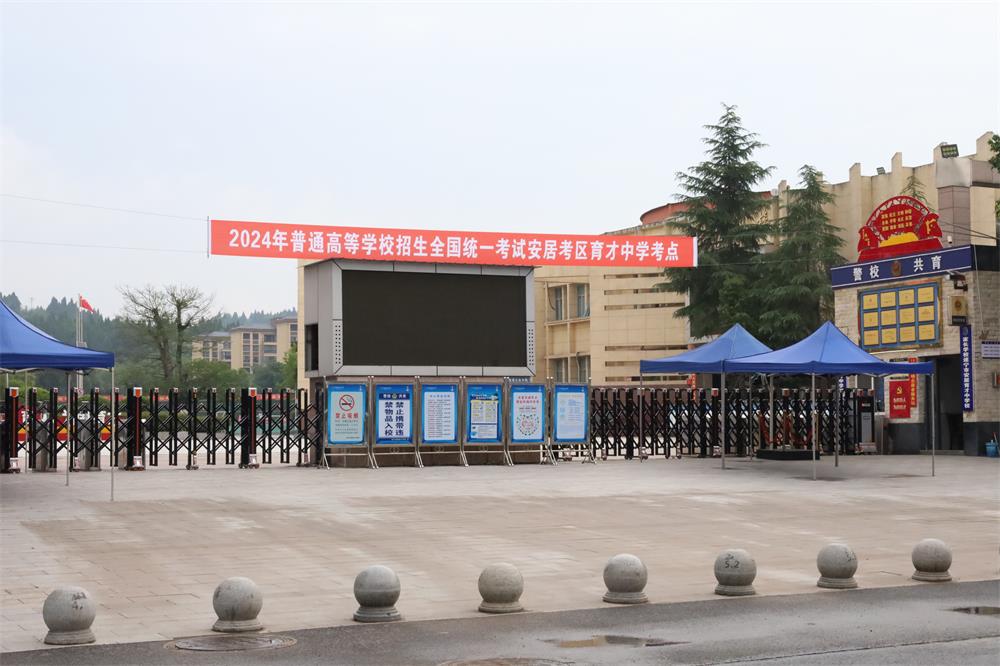 6月7日,全国高考首日。上午8时许,天空还飘着绵绵细雨,安居区3331名考生开始陆陆续续撑着伞进入安居育才中学考点,参加2024年普通高考。