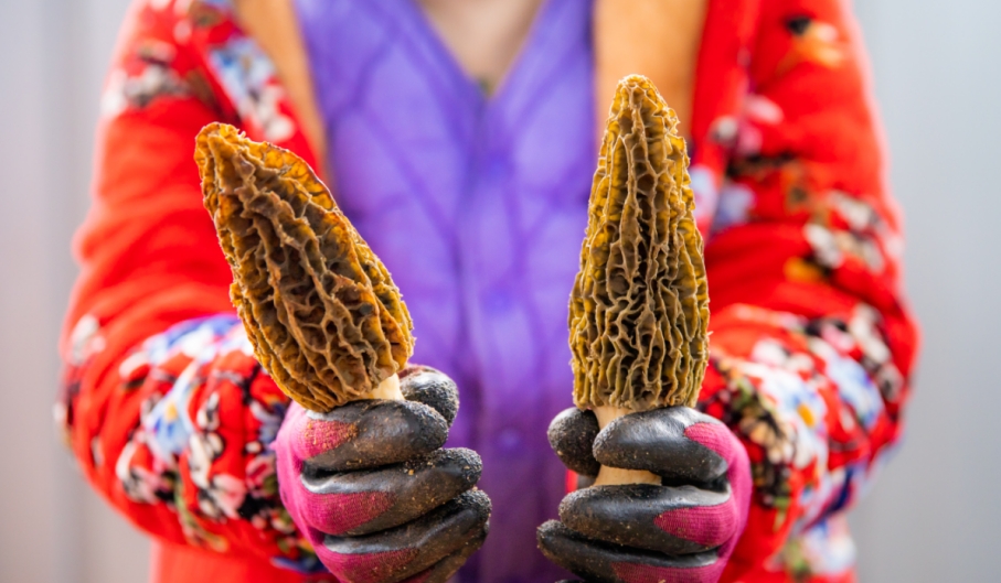 油草沟村的羊肚菌从本月初开始采摘,每天采收鲜菌800余斤,但因菌苗密布垄沟,工人需踮脚行走以防踩坏菌种,采收的进度被“幸福的产量”拖慢了节奏。基地管理人员徐莉红拿着一朵羊肚菌向记者介绍道:“菌头和菌柄分开做精品加工,每朵都要‘精修’才能卖上好价钱。”