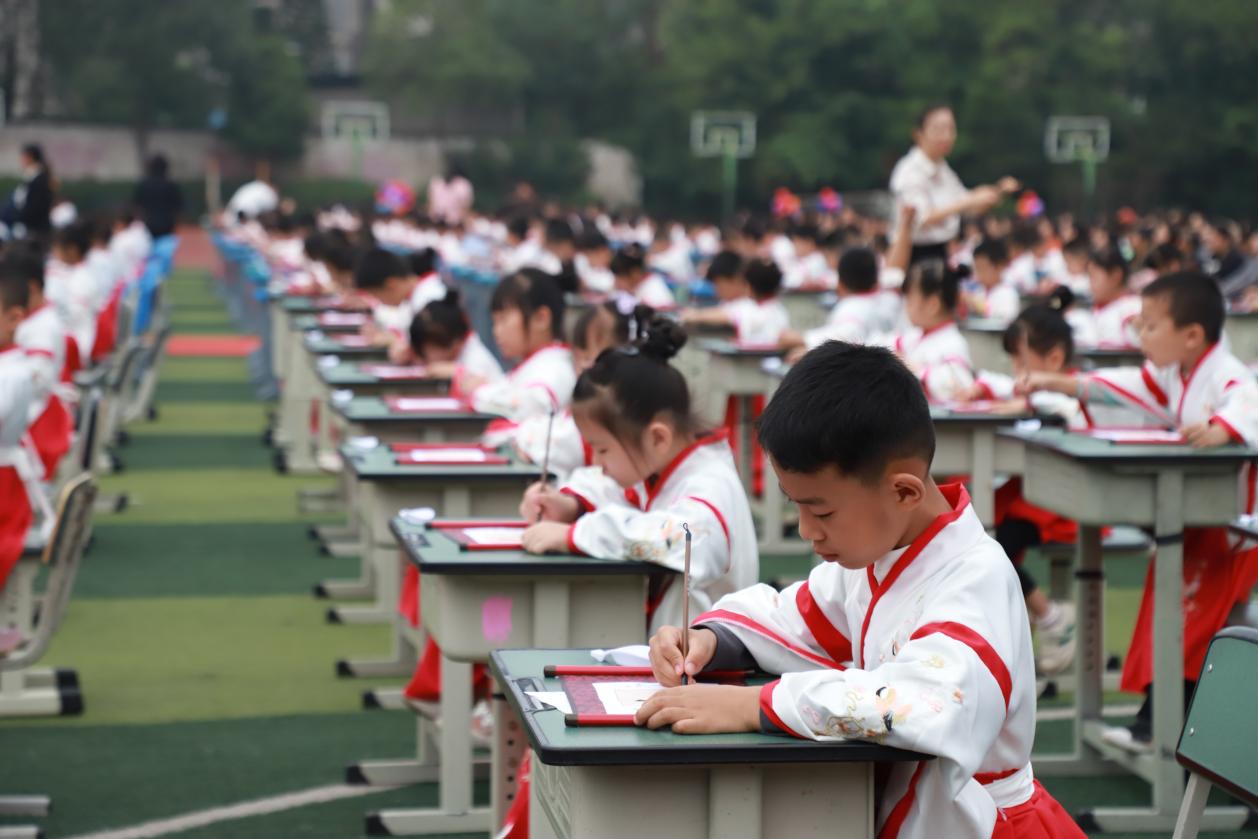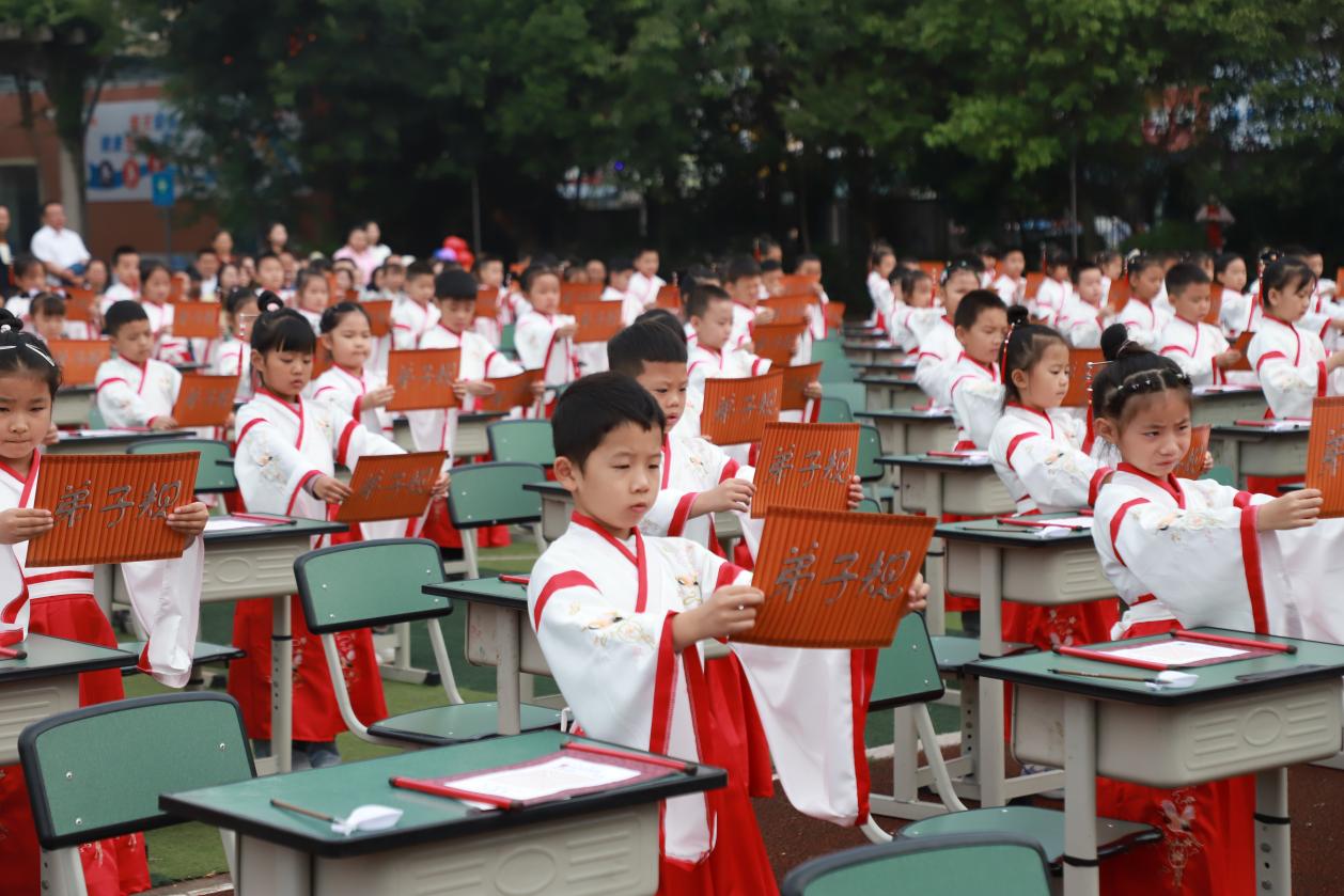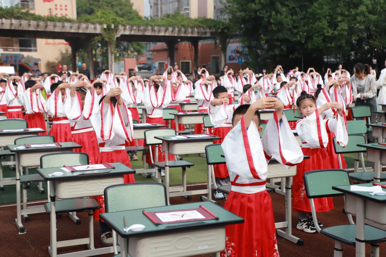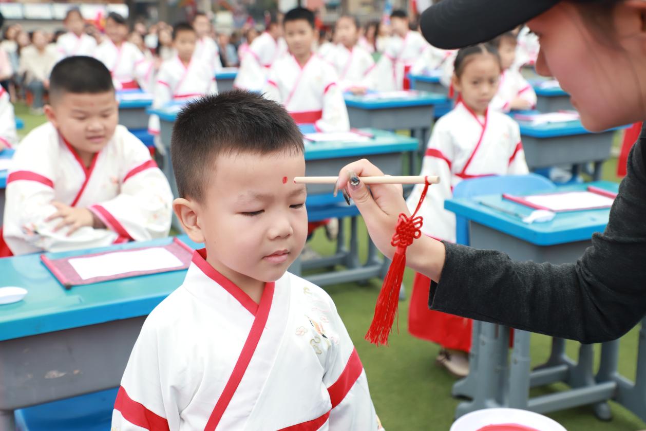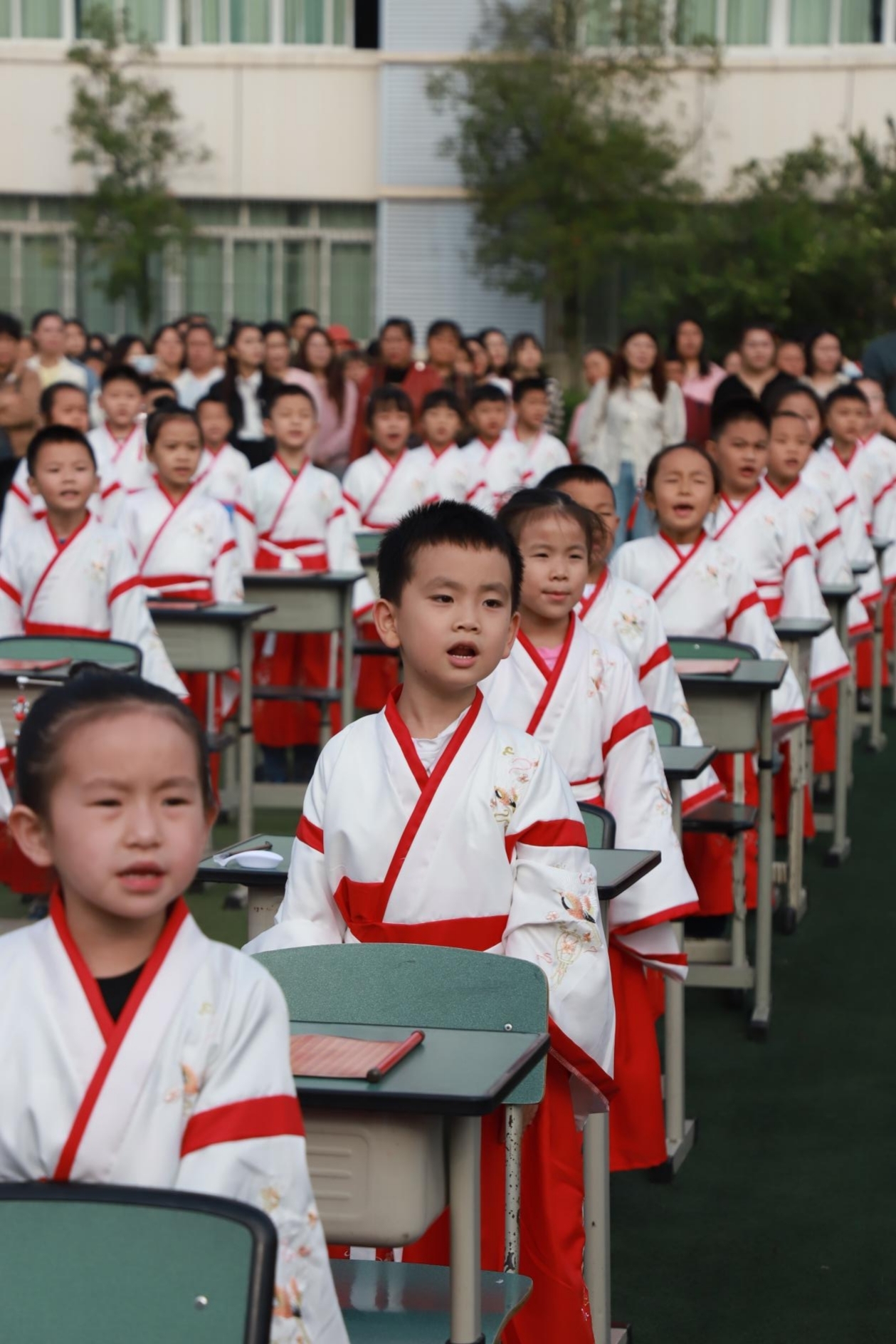 活动当天,学生与家长共同参与启蒙启智仪式、常规展示和亲子活动。学生们身着汉服,通过正衣冠、诵弟子规、朱砂启智、击鼓鸣志、破笔开蒙、敬师亲等环节,感受传统文化的魅力。