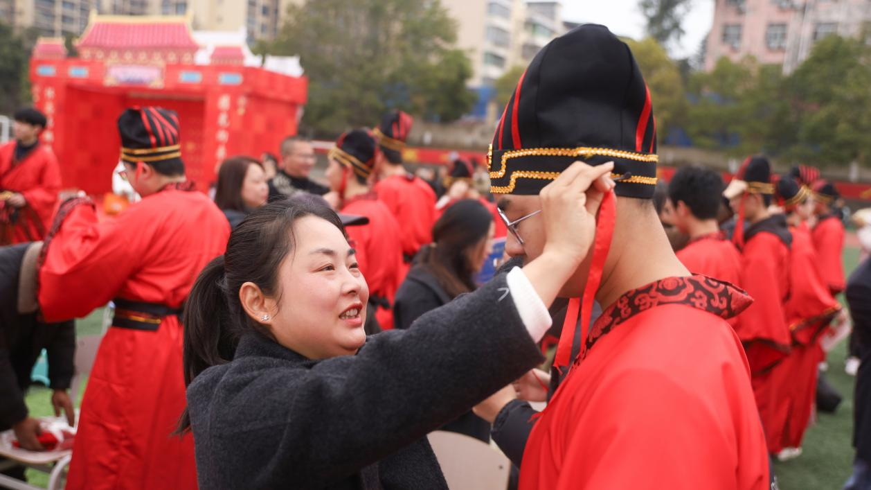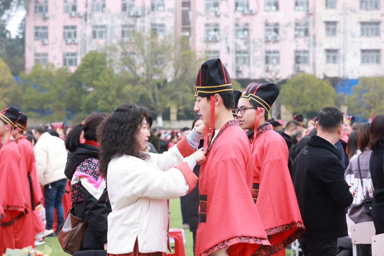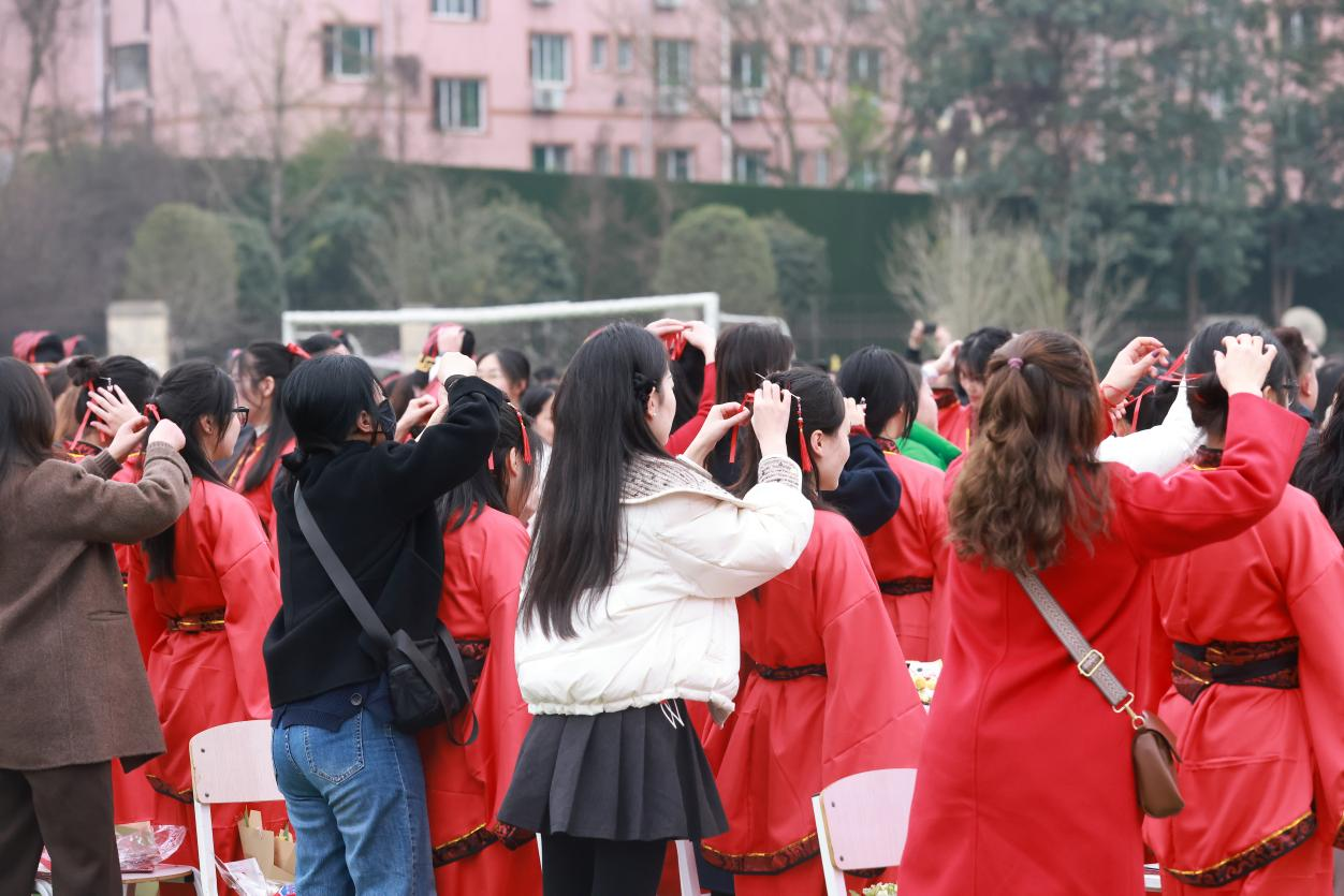 现场,家长为孩子们加冠(及笄)