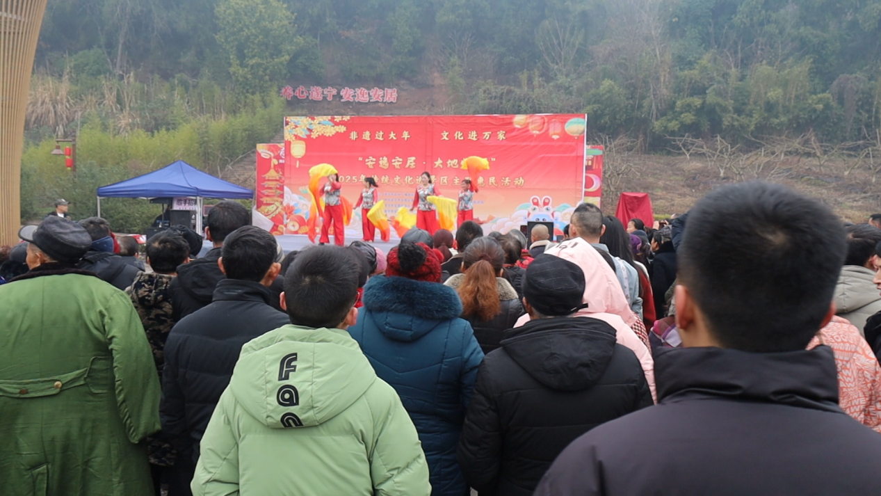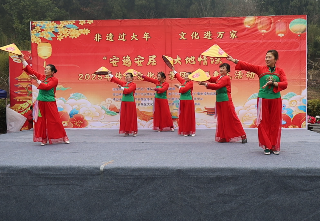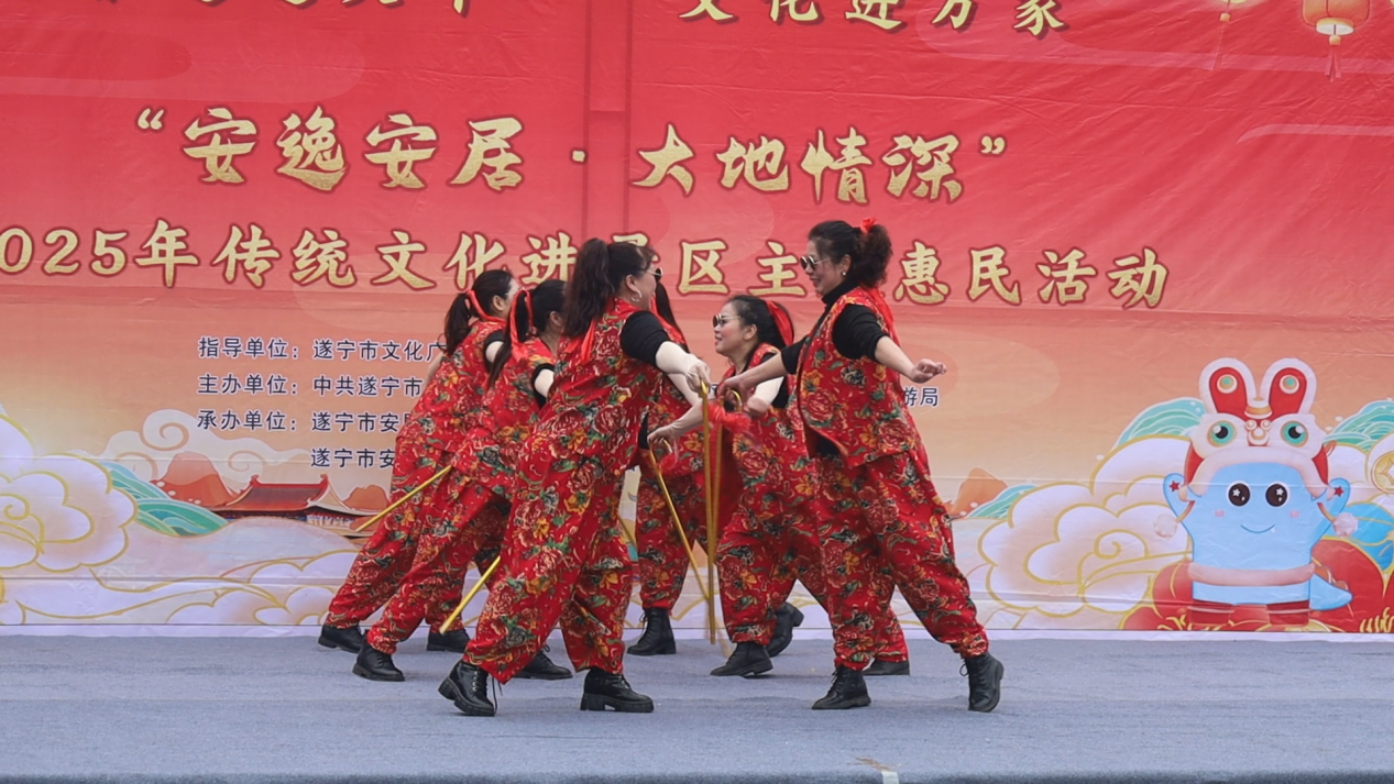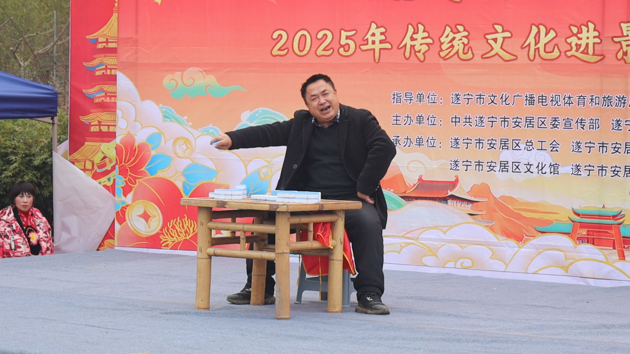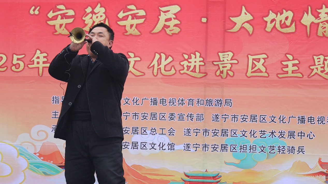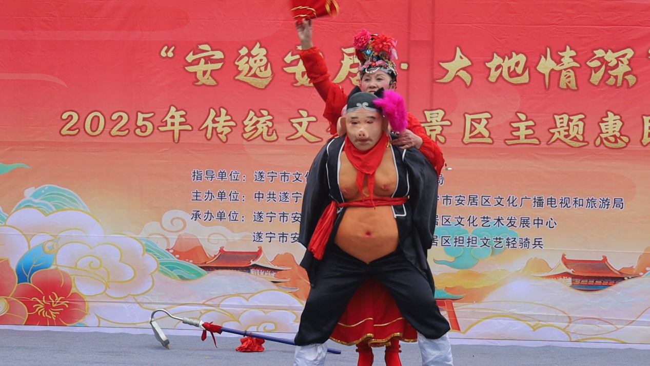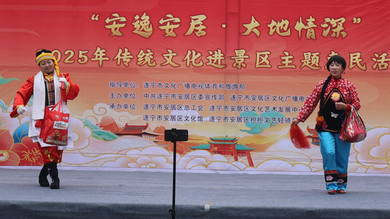上午10点,园区内锣鼓喧天、人潮涌动,一场以“安逸安居 大地情深”为主题的2025年传统文化进景区惠民活动在此盛大启幕。来自安居区担担艺术团的演员们以一场欢快喜庆的舞蹈拉开帷幕,唢呐独奏、原创歌舞《猪八戒背媳妇》、单口相声、拐杖舞等节目轮番上场,引得游客掌声不断。