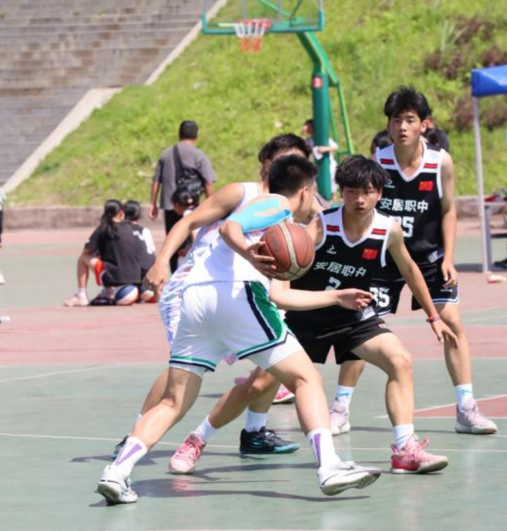 发球、传球、运球、抢断……来自安居育才中学和安居职中的两队队员在场上展开了激烈的攻防转换战。双方你来我往,让人目不暇接,引起了阵阵欢呼声和掌声。