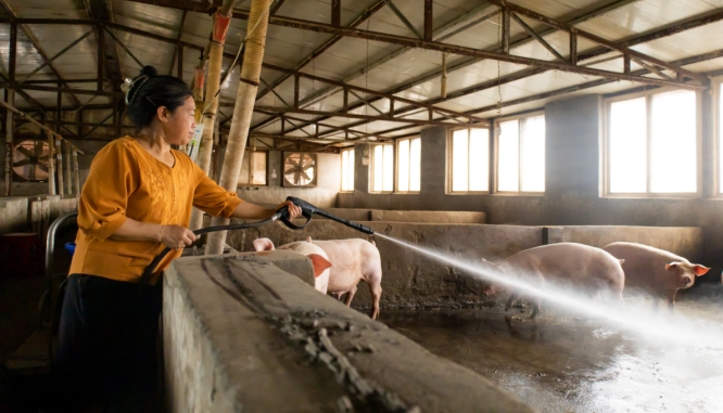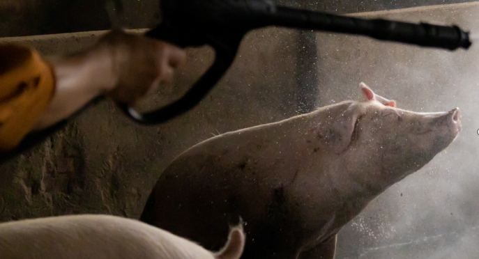 在风机、水帘等通风降温设施的运行下,猪场内的温度有所下降。为了进一步制造清凉的环境,饲养员还会每天不定时用喷水枪给生猪“洗澡”降温,水流同时也会清洁猪圈的环境,避免气温升高滋生细菌,影响生猪生长。