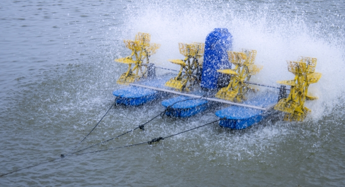 “水温高,气压低,水体溶氧会下降得很快,尤其是晚上很多池塘塘口都会处于亚缺氧状态。”针对这一情况,渔场购置了浮式增氧泵和水车型增氧机,每个鱼塘放置2到3个,全天候增氧,为鱼儿们制造适宜的生长环境。