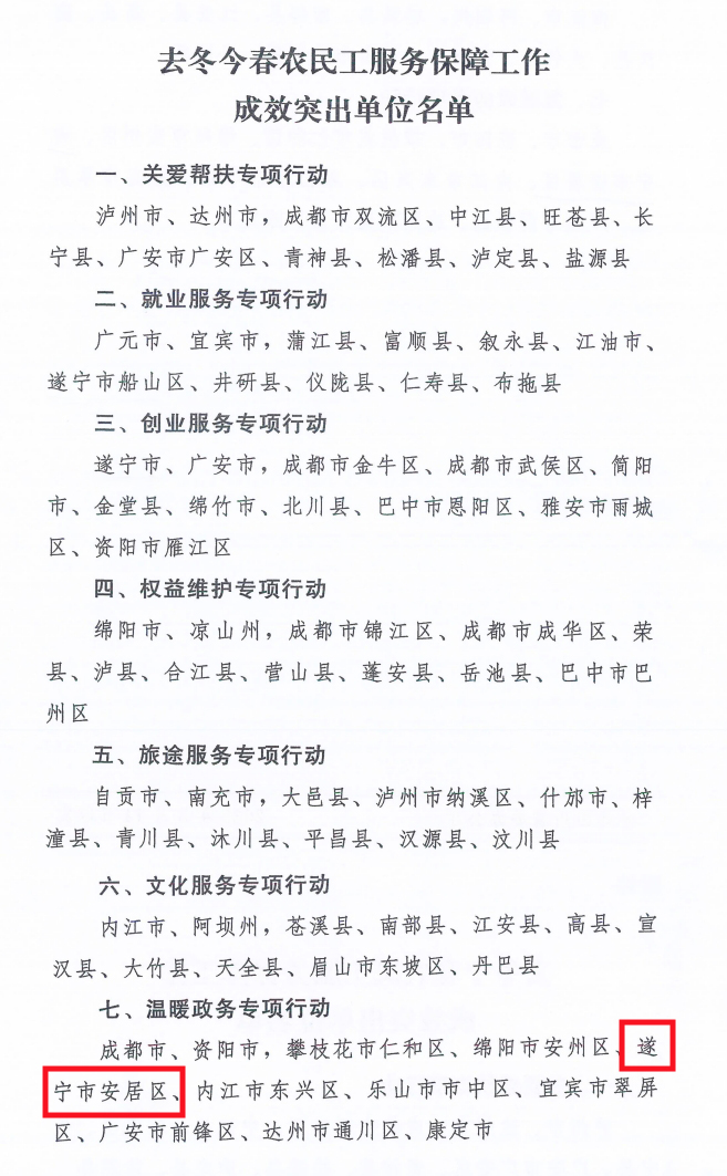 近日,省委办公厅、省政府办公厅通报表扬全省去冬今春农民工服务保障工作成效突出单位,安居区获“温暖政务专项行动”成效突出单位,这是安居区连续五年被通报表扬。