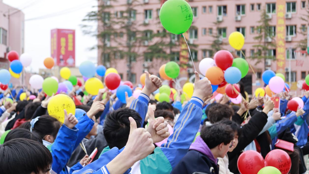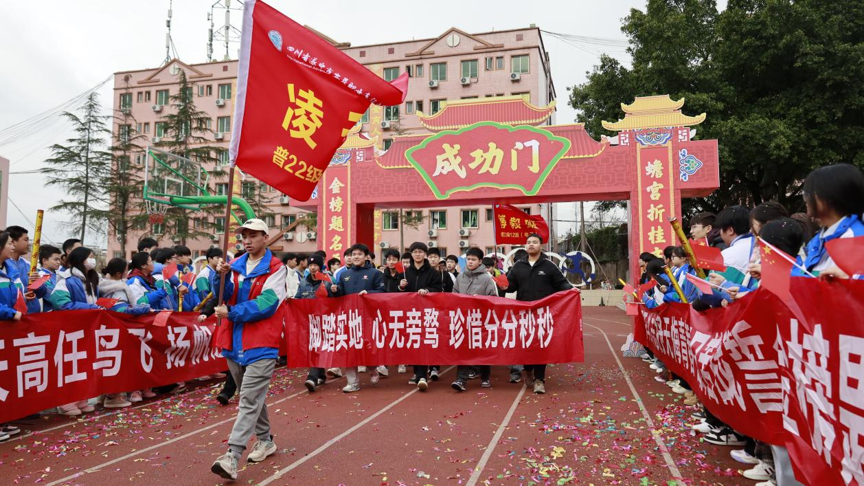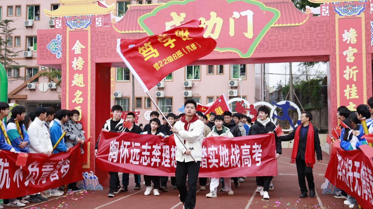 百日誓师,犹如利剑出鞘,蓄势待发;决胜高考,犹如破茧成蝶,期待飞翔。伴随着激昂的音乐,在校领导和老师们的陪同下,高三各班学生依次列队,挥舞班旗,拉本班横幅,呼喊口号,跨越成才门。他们昂首挺胸,意气风发,向校老师们、学弟学妹们展现自己朝气蓬勃的青春活力与迎接未来的坚定信心。