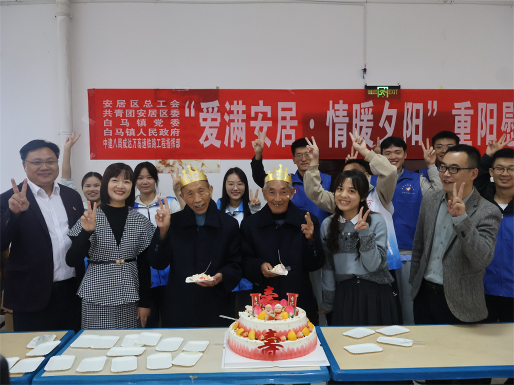 岁岁重阳,今又重阳。10月11日,在重阳节这个尊老敬老的传统佳节里,安居区总工会、共青团安居区委联合白马镇党委政府及爱心企业中建八局成达万项目部在白马镇中心敬老院联合开展志愿慰问活动,20余名青年志愿者与院内40余名老人共庆重阳,弘扬中华民族传统美德,让老人感受到浓浓的敬老情。