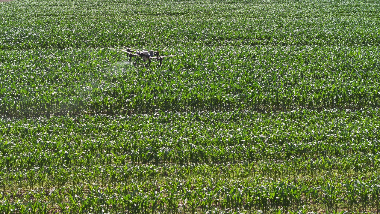 在遂宁大豆现代农业园区奉光荣种植家庭农场,600余亩春玉米郁郁葱葱,已陆续进入拔节期,长势喜人。玉米地中,一架植保无人机正来回穿梭,精准地将药剂喷洒在玉米叶片上,仅1分钟便完成了1亩玉米的飞防作业。