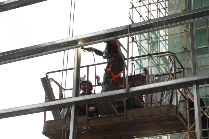 工人们在钢结构框架间有序穿梭