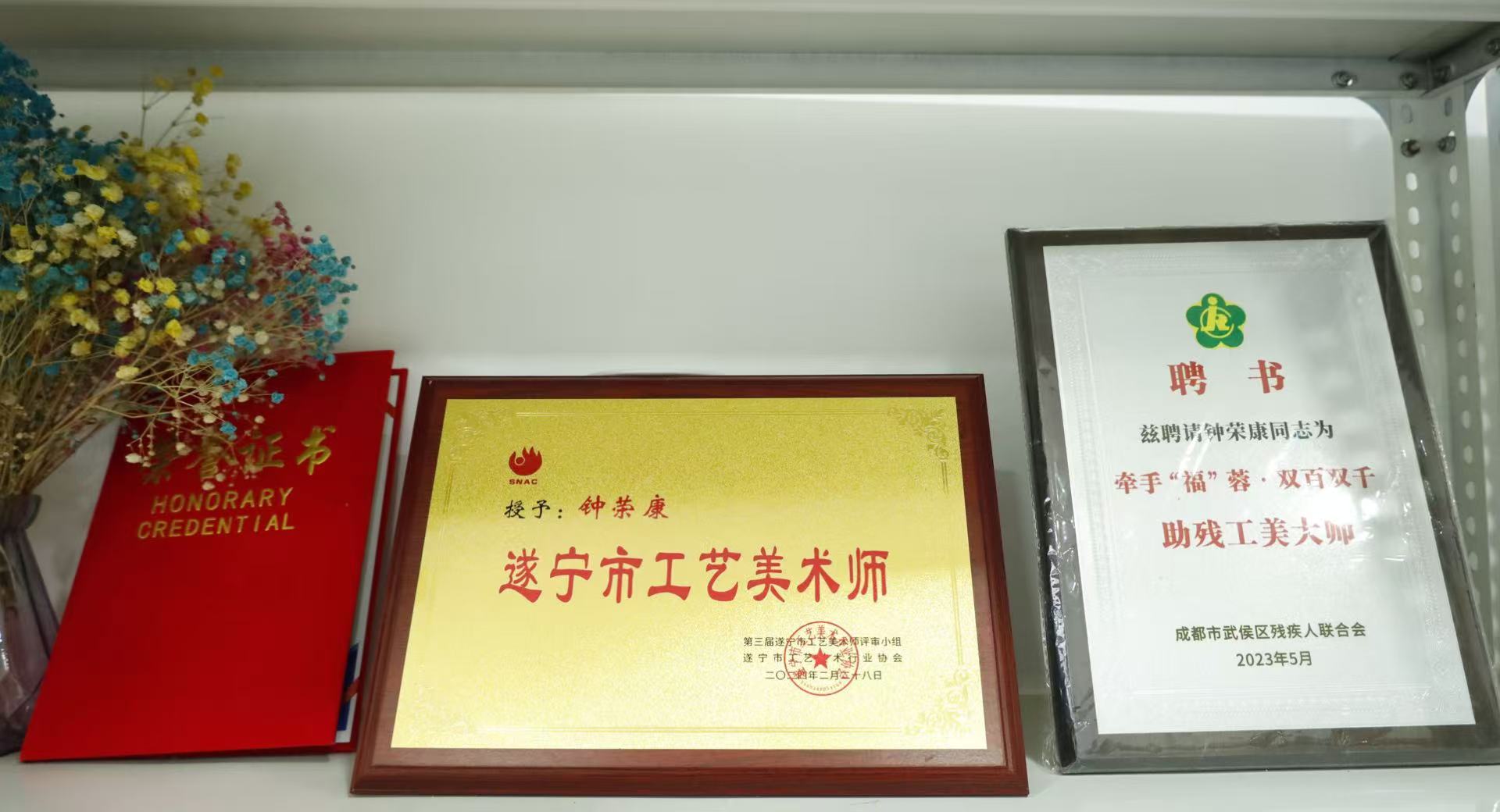 据悉,钟荣康出生地遂宁安居,是灵广竹编的发源地,受外公的影响,他从小便喜欢竹编。2005年,由于高空坠楼受伤导致残疾,经历了人生的“至暗时刻”,但他没有自暴自弃,为了生活,萌生了成为竹编“手艺人”的想法。2022年,他通过发光蜗牛非遗助产项目开始报名学习,自此开启他的“竹编之路”。2023年钟荣康荣获全省残疾人技能大赛三等奖;2024年荣获“遂宁市工艺美术师”称号。