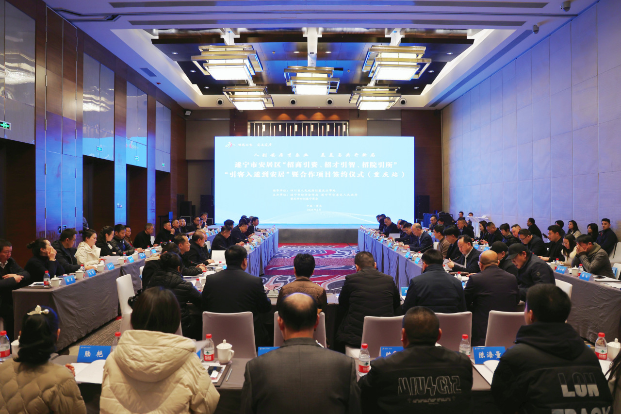 2月7日上午,由四川省人民政府驻重庆办事处指导,遂宁市经济合作局、遂宁市安居区人民政府、重庆市遂宁商会主办的遂宁市安居区“招商引资、招才引智、招院引所”“引客入遂到安居”暨合作项目签约仪式(重庆站)举行,诚邀安居在渝乡贤、遂宁商协会、企业、合作科研院所、优秀学子等方面代表齐聚一堂,共叙桑梓之情、共商发展大计、共绘美好蓝图。