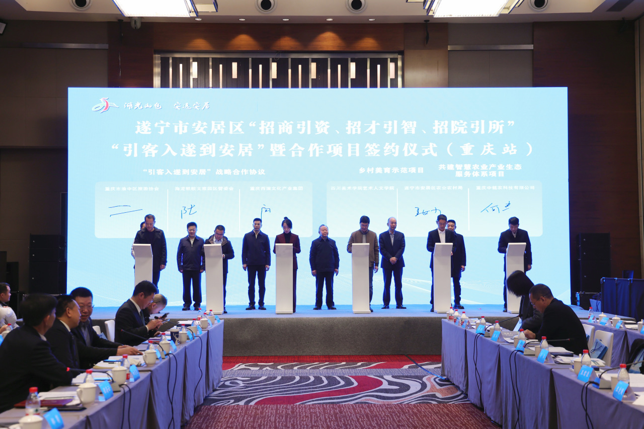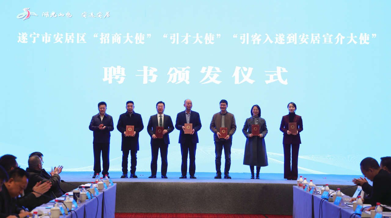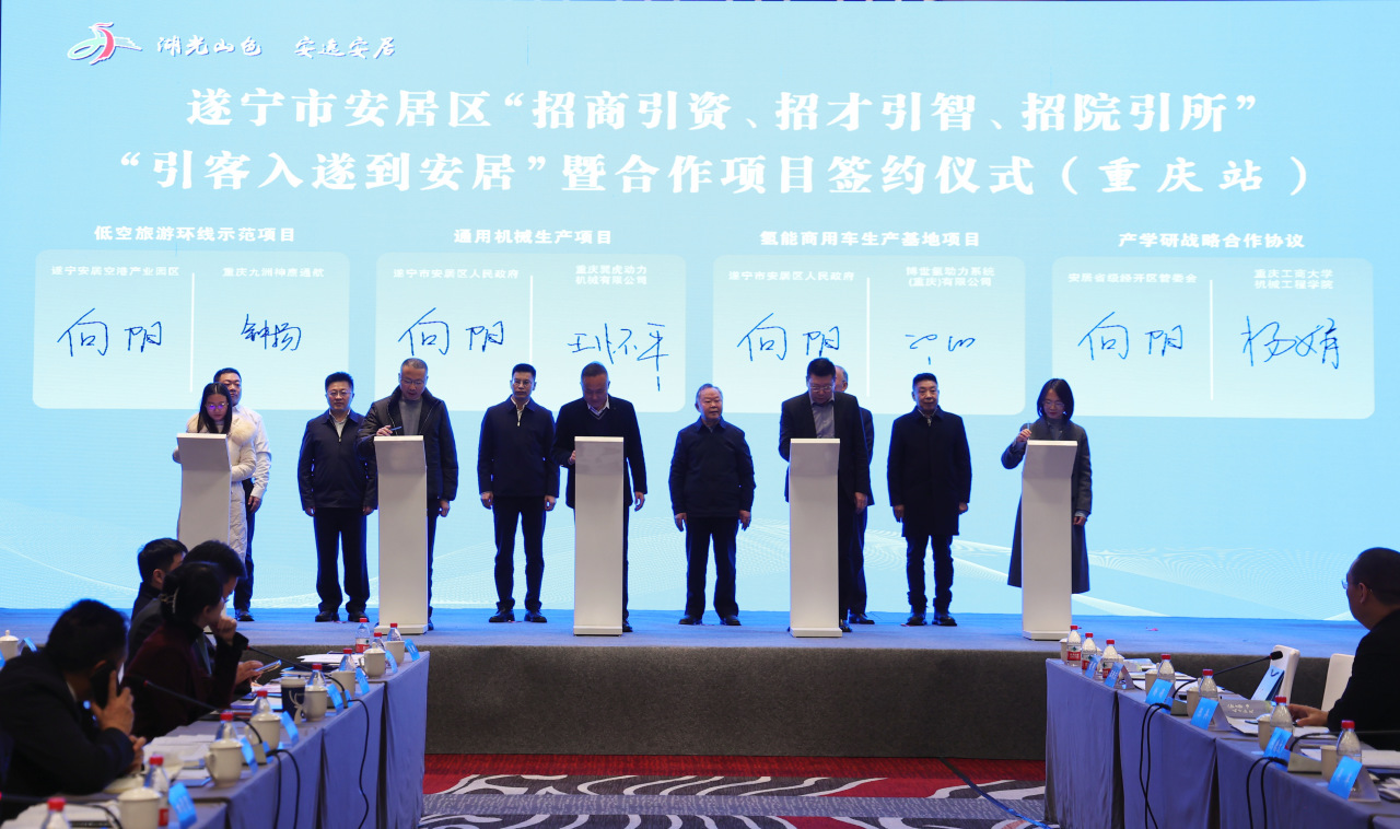 仪式上,安居向六名乡贤颁发了“招商大使”“引才大使”引客入遂到安居宣介大使”聘书,签约博世氢能商用车生产基地项目、通用机械生产项目等汽车装备制造、低空经济、产教融合、乡村振兴、文化旅游项目7个。