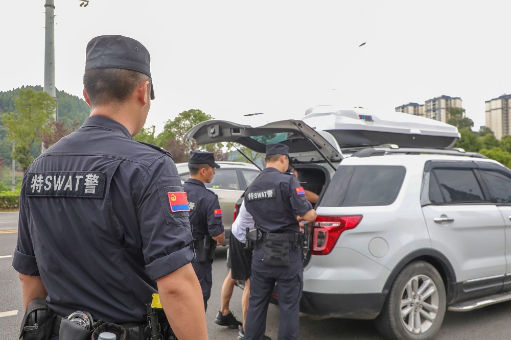 在安居区八角社区,区特警大队正在对来往车辆进行排查。“我们特警大队按照两组运转,全员无休的工作模式,积极向武装部协调民兵,协助大队开展联防联勤联动,增强街面屯警、巡逻防控、应急处突等工作的人员保障,切实维护好大运会期间的辖区安全。”区特警大队指导员何建伟这样说道。