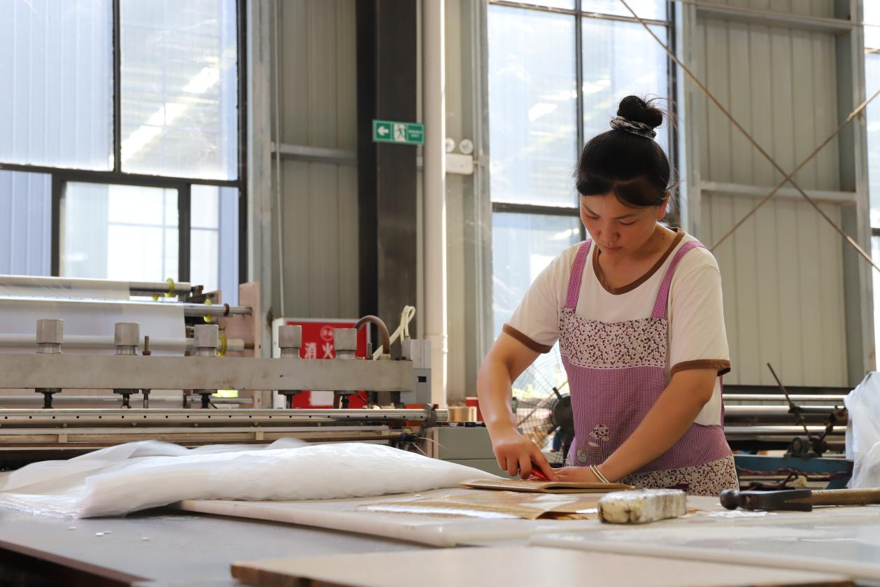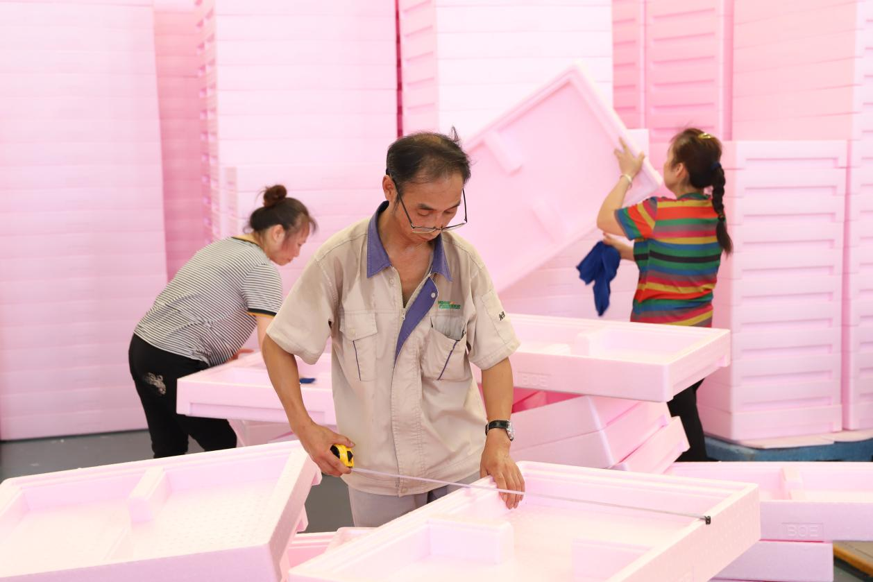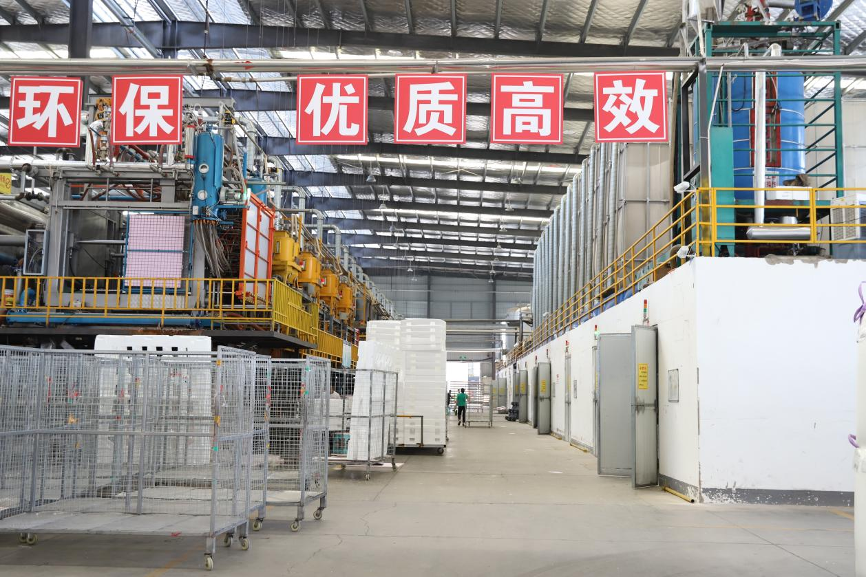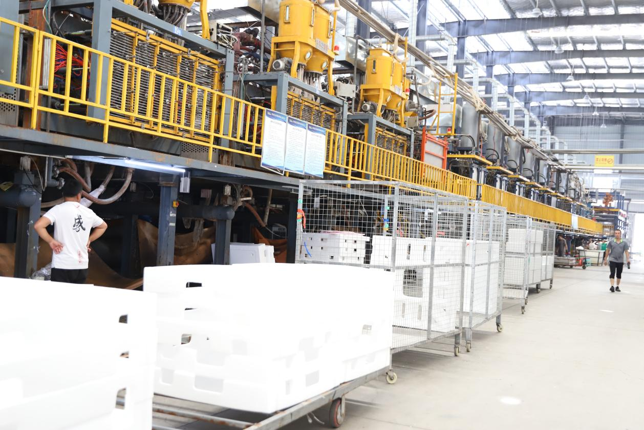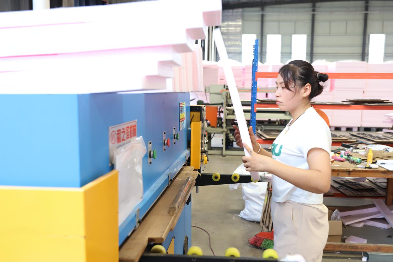 走进四川优弗利生产车间,数十台自动化设备高效运转,蒸汽喷涌间,各类泡沫包装材料被源源不断地产出。工人们在各自岗位上忙碌,进行搬运、清理和打包作业。为应对高温,车间内大型风扇、空调扇持续运行,有效改善作业环境。