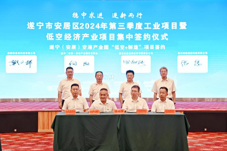 9月29日下午,安居区举行低空经济产业项目集中签约仪式,总投资11亿元的4个项目成功签约,涉及通用航空智能制造、低空文旅产业发展等领域。
