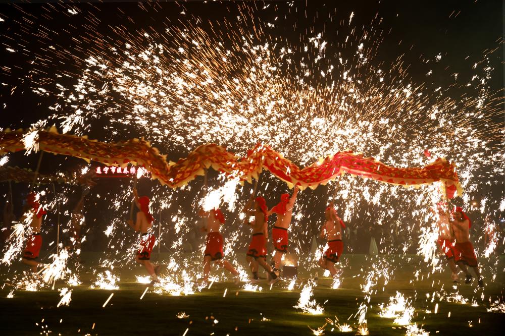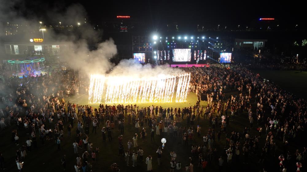 除民俗体验外,凤凰栖景区内,电音摇滚、烟花瀑布以及川剧吐火变脸、打铁花、火壶等非遗表演轮番上演,为游客带来震撼的视觉盛宴,现场掌声不断。