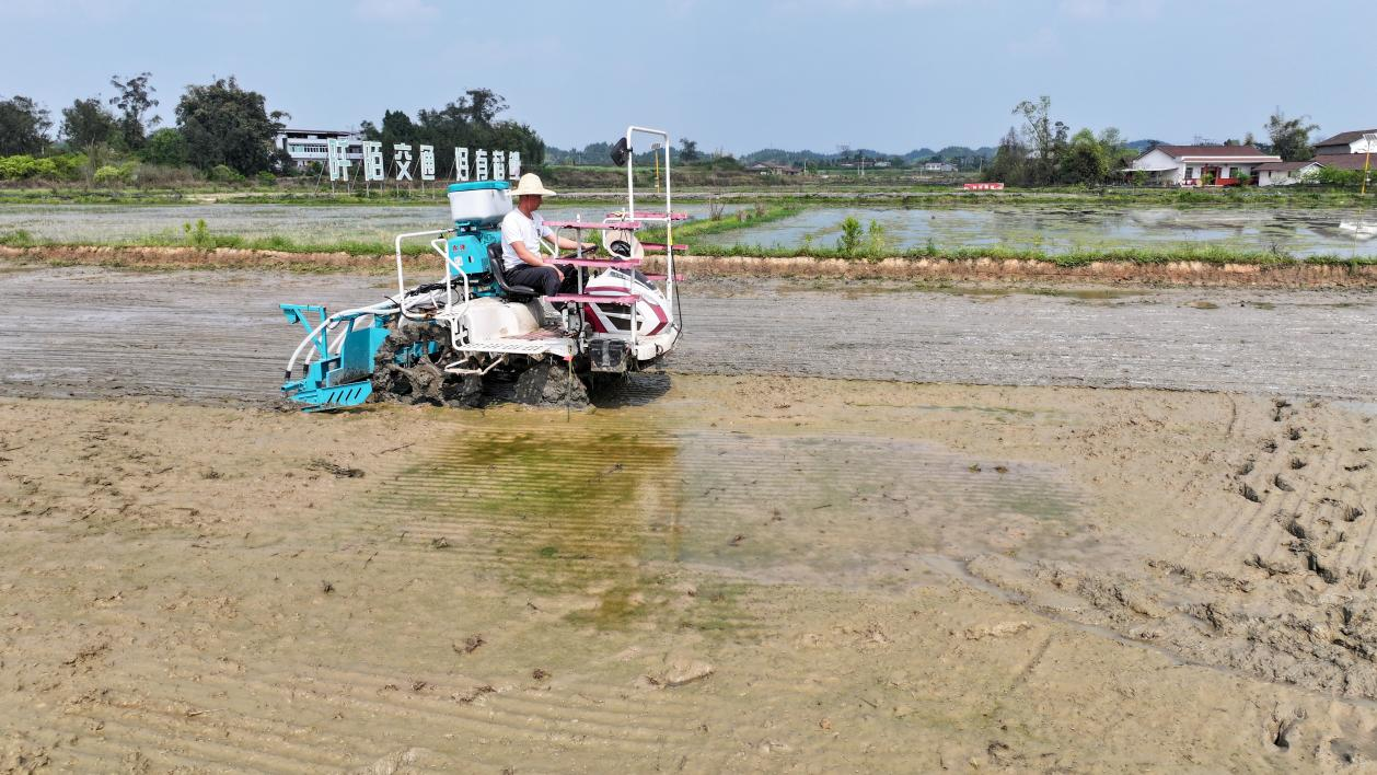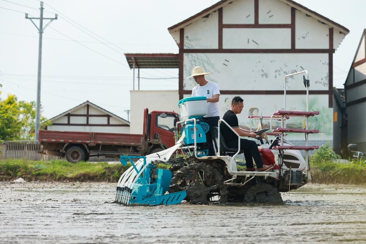 田间作业现场,农机手驾驶插秧机匀速行进,成排稻种均匀嵌入湿润的泥土,不到10分钟就完成2亩水田的播种作业。“一台插秧机日作业量可达80亩,播种成行成排,有利于通风透光,减少后期病虫害发生。”