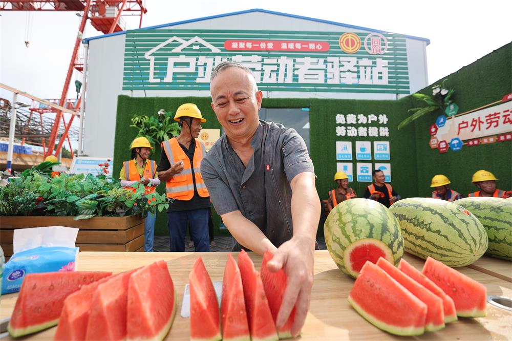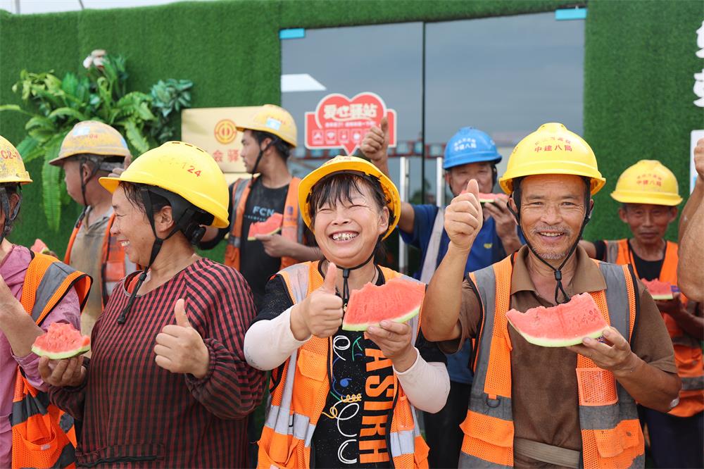 据介绍,入夏以来,为进一步做好高温季节防暑降温工作,项目指挥部实行夏季错峰施工,确保夏季施工安全与施工进度;每日定时为现场工人送绿豆汤、西瓜,配备藿香正气水、风油精、凉茶等物资,全面保障职工身心健康。