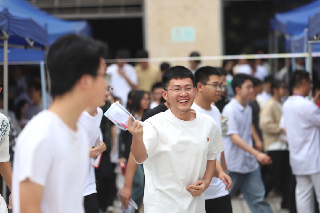 考生们分别从不同考场如潮水般涌出,他们或面带笑容打出“胜利”手势,或欢呼雀跃与同学激动奔跑,或眼含泪花与父母、老师深情拥抱。