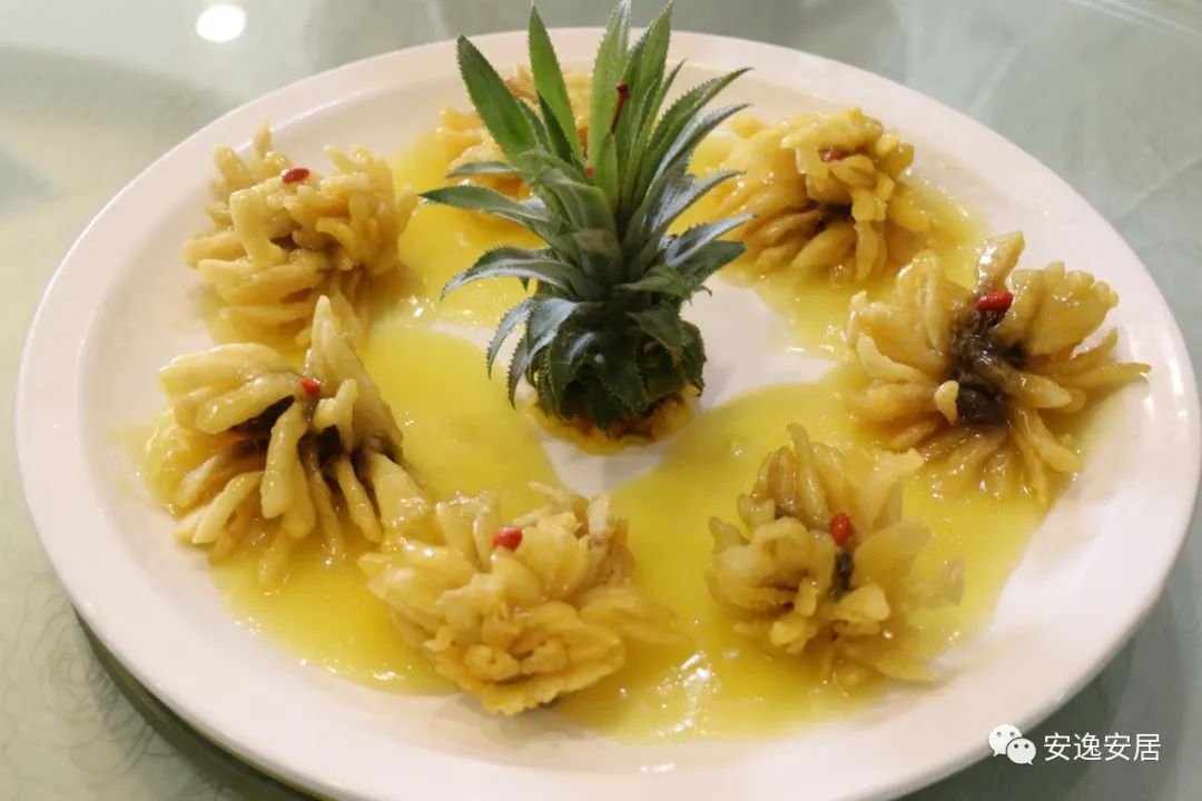 精选3斤草鱼,梨花刀切好,均匀扑上干粉,炸制定型,到外酥里嫩,再用菠萝汁勾芡调味。成菜用传统手法制作,肉质脆嫩,入口酥脆,特加入菠萝汁,使之口感更加醇厚,此菜体现出细腻的刀工和传统烹饪技术的完美结合。