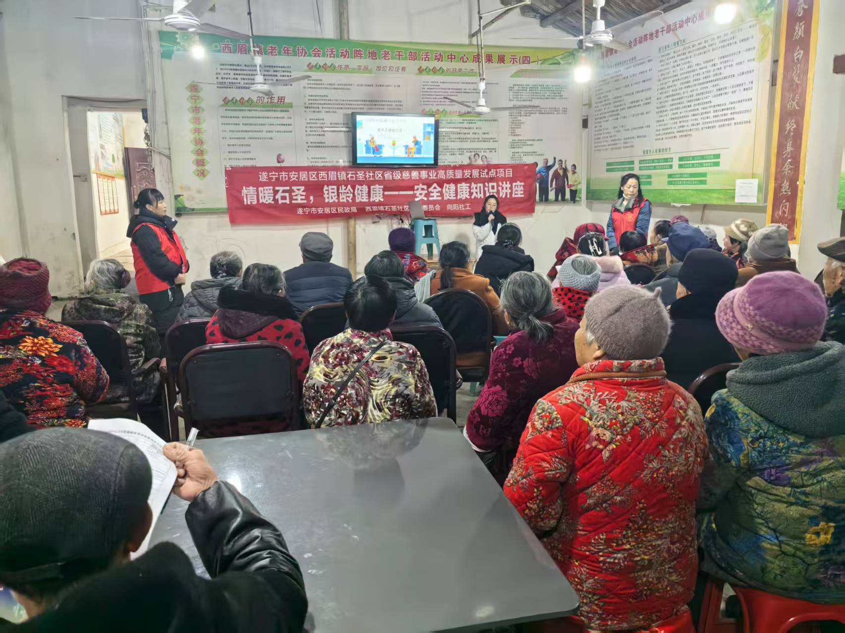 近日,西眉镇石圣社区开展了以“情暖石圣 银龄健康”的安全健康知识讲座活动,吸引了40余名老年居民积极参与。活动涵盖多个实用且有趣的环节,在健康养生环节,专业医生走上讲台,用通俗易懂的语言深入浅出地讲解了各类疾病的预防方法与保健知识。手指操教学环节同样精彩,工作人员站在台前,耐心地示范着每一个手指操动作,老人们满怀热情,跟着节奏认真地做起手指操来,老人们在锻炼的过程中,彼此之间还不时交流互动,分享着自己的感受,现场洋溢着温馨和谐的氛围。
