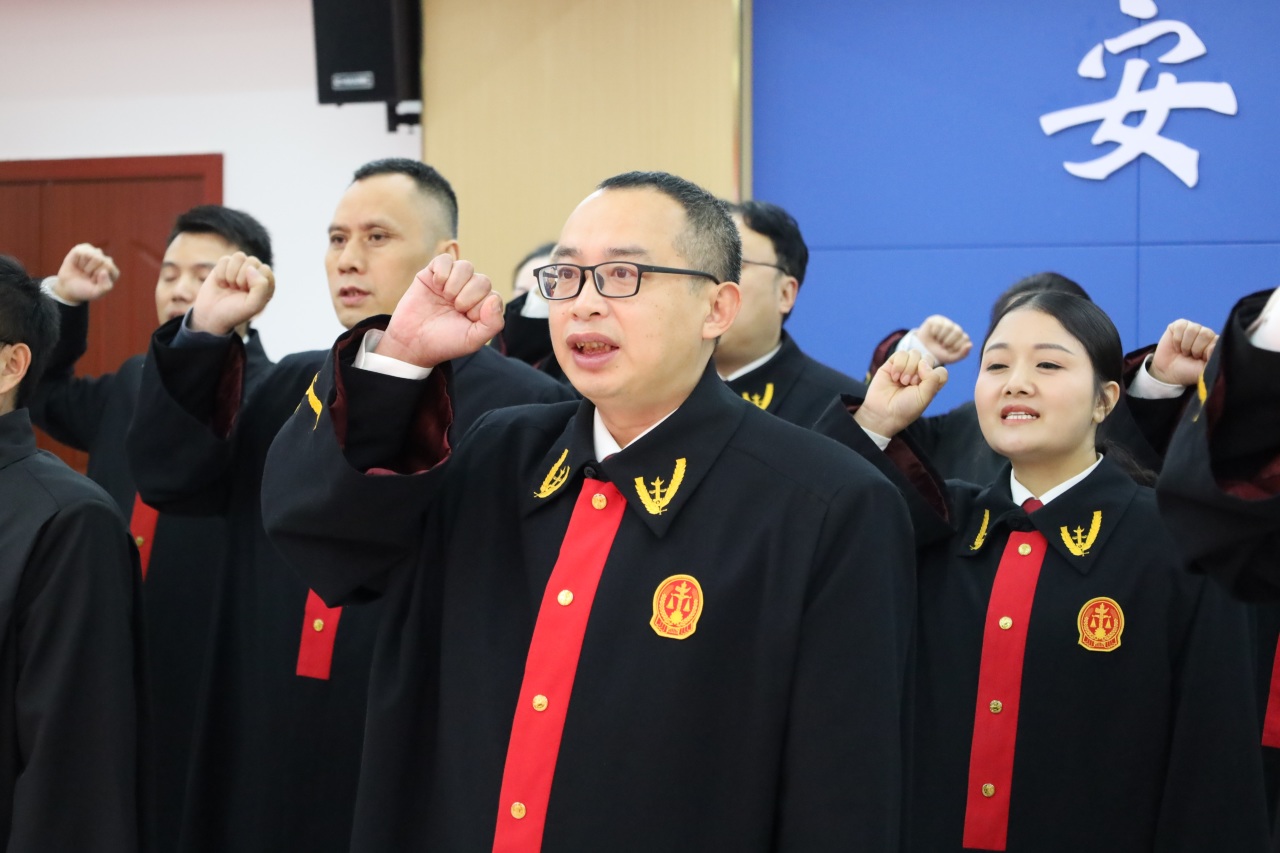在区人民法院党组书记、院长陈然的带领下,法官们身着法袍,高举右手,面向国旗庄严宣誓。铮铮誓言,字字千钧。每一句都蕴含着法官们对宪法和法律的无限忠诚,彰显了他们司法为民、公正司法的钢铁决心。