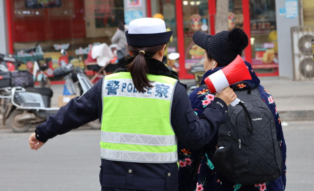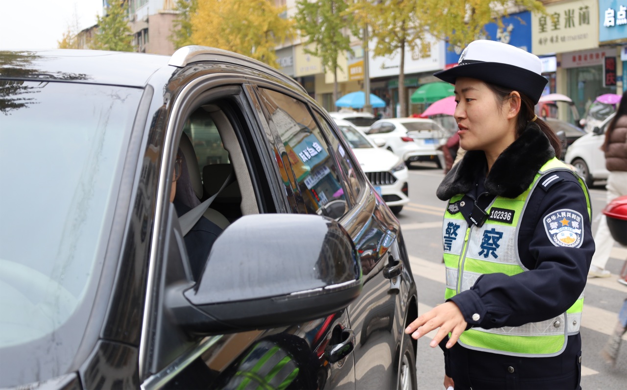 交警小姐姐面带微笑,温柔地劝导路人的不文明、不安全交通行为,告诫大家遵守交通规则。大家纷纷表示,以后一定遵守交通规则,文明出行。