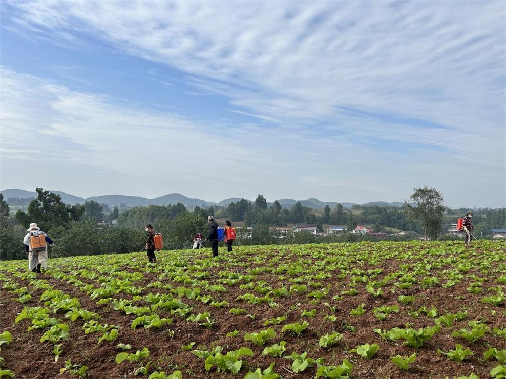 与此同时,村里的青菜管护也在如火如荼地进行。数十名工人在青菜田里熟练地操作喷雾器,为本月底的丰收打下坚实基础。“这次村集体种植的青菜面积有180多亩,喷药主要是增强青菜抗旱能力,保障其良好生长,预计3天完成喷药作业,之后持续养护至收获,确保青菜顺利进入市场。”青菜基地管理员王艳福说。