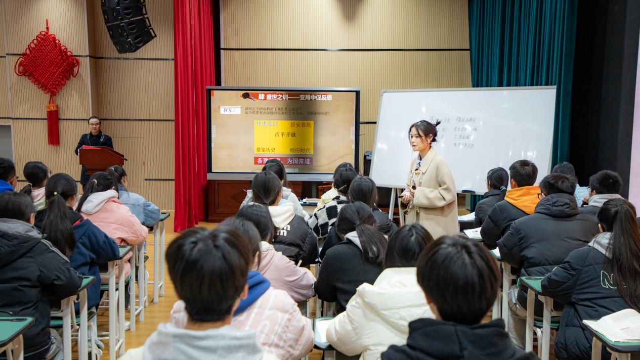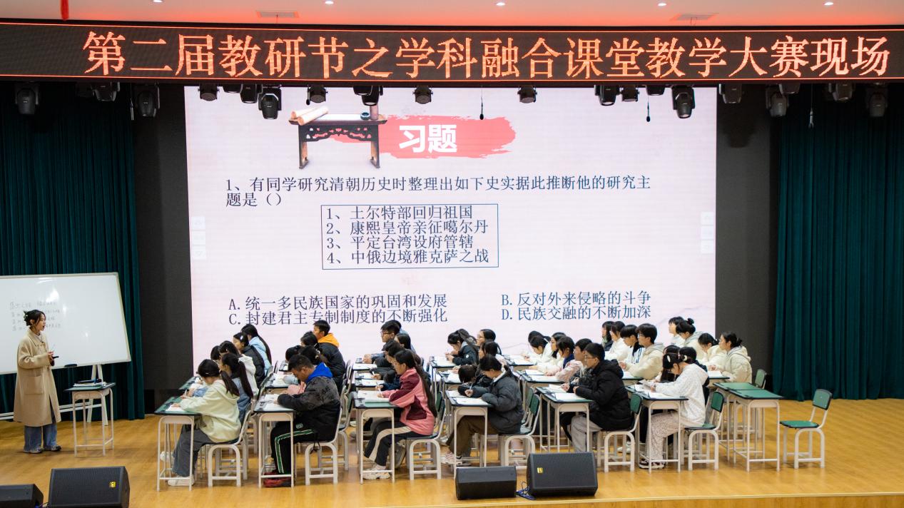 文科比赛现场,历史学科教师陈红以《历史多学科融合之辉煌与沉沦·清朝前中期的鼎盛与危机》为题,从盛世之貌、盛世之制、盛世之危、盛世之训四个方面,通过图文、小视频、讨论等学生喜爱的方式,引导学生积极思考,全面深入地讲述了清王朝由盛及衰的发展历史。“这次教研活动对我的教学技能有很大的提升,在整个赛课过程中老师们互相帮助,激发了我们的创作热情和激情。”安居中学历史教师陈红表示。
