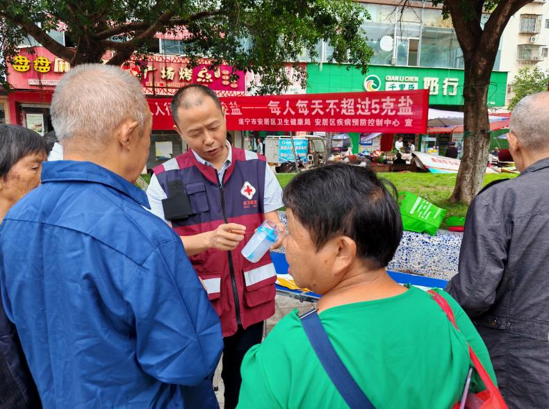 9月19日上午,,安居区卫生健康局、安居区疾病预防控制中心及城区社区卫生服务中心在安居城区24米街头陀寺广场开展全民健康生活方式宣传月暨全国减盐周宣传活动。