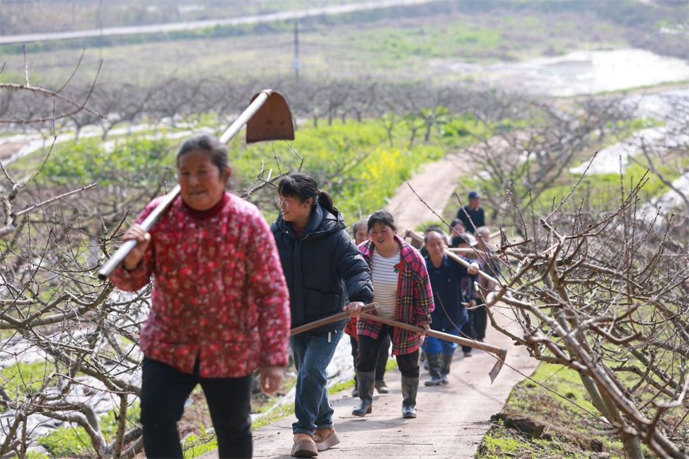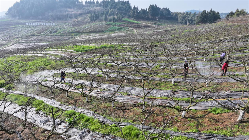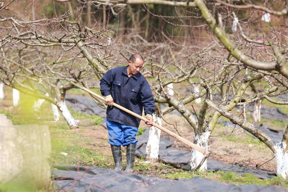 在桃林中,十余名村民正有序地为桃树施药、除草,以精细化的管理为鲜桃丰收打下坚实基础。
