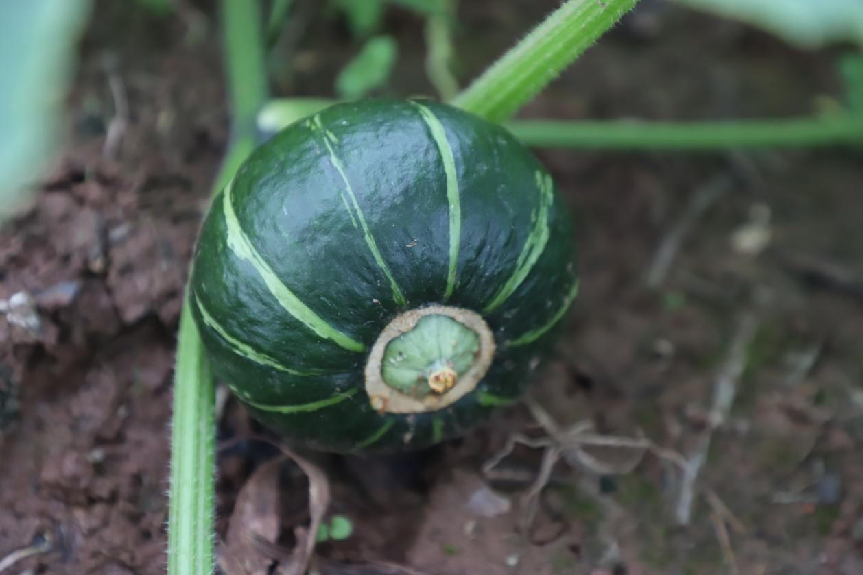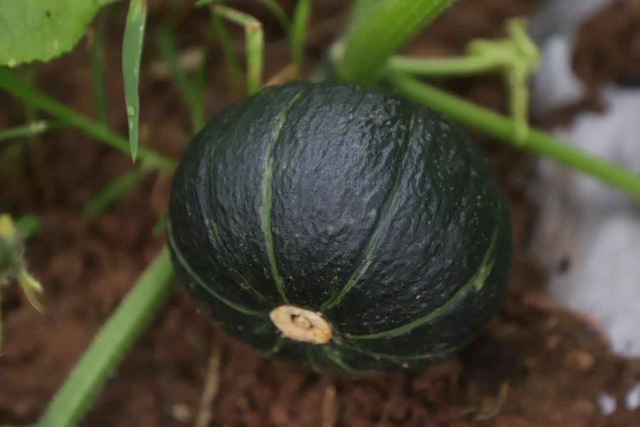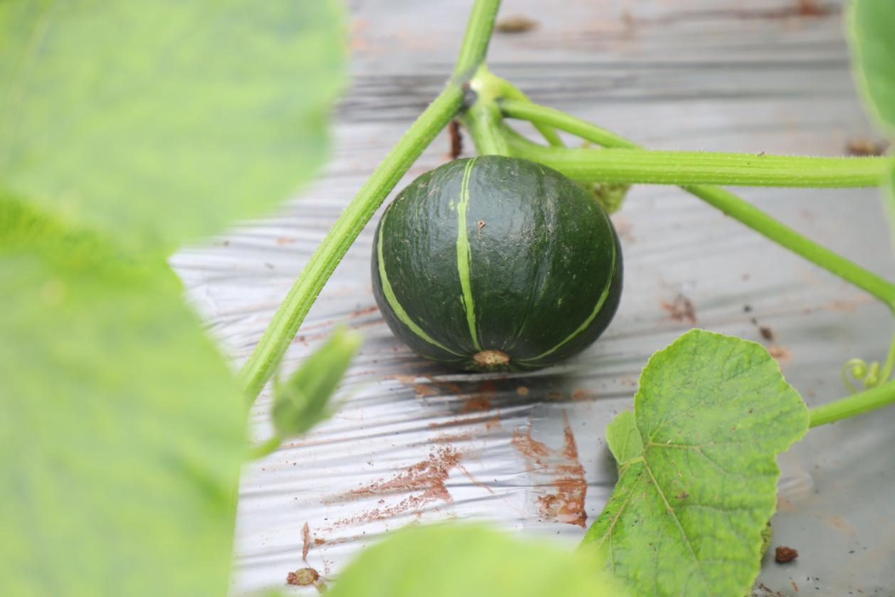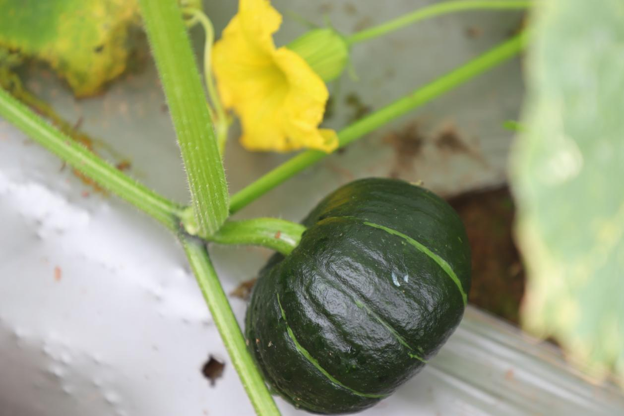 10月24日,在海龙凯歌的贝贝南瓜种植基地,五十余亩田地绿意盎然,藤蔓间点缀着一个个即将成熟的贝贝南瓜。
