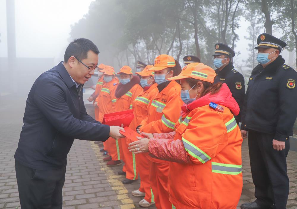 “安居城市面貌改善提升,大家作出了很大贡献。”杨文彬来到区综合执法局,看望慰问春节期间坚守岗位的环卫工人、城管人员,感谢大家过去一年对安居城市建设管理和发展作出的贡献。希望新的一年,大家继续发扬不怕苦、不怕累的爱岗敬业精神,及时清扫、清运垃圾,进一步提升道路清扫保洁水平,把我们的城市打扮得更加亮丽,为城市品位提档升级、市民幸福指数不断攀升作出新的更大贡献。