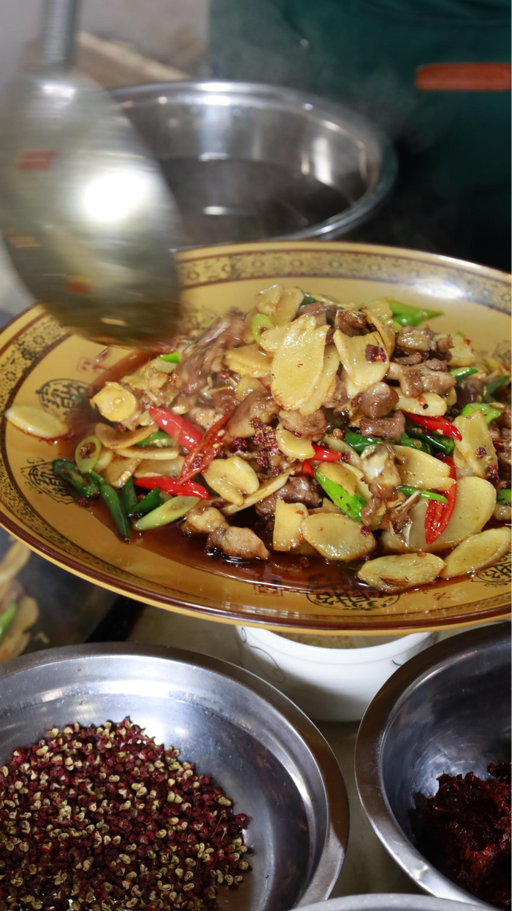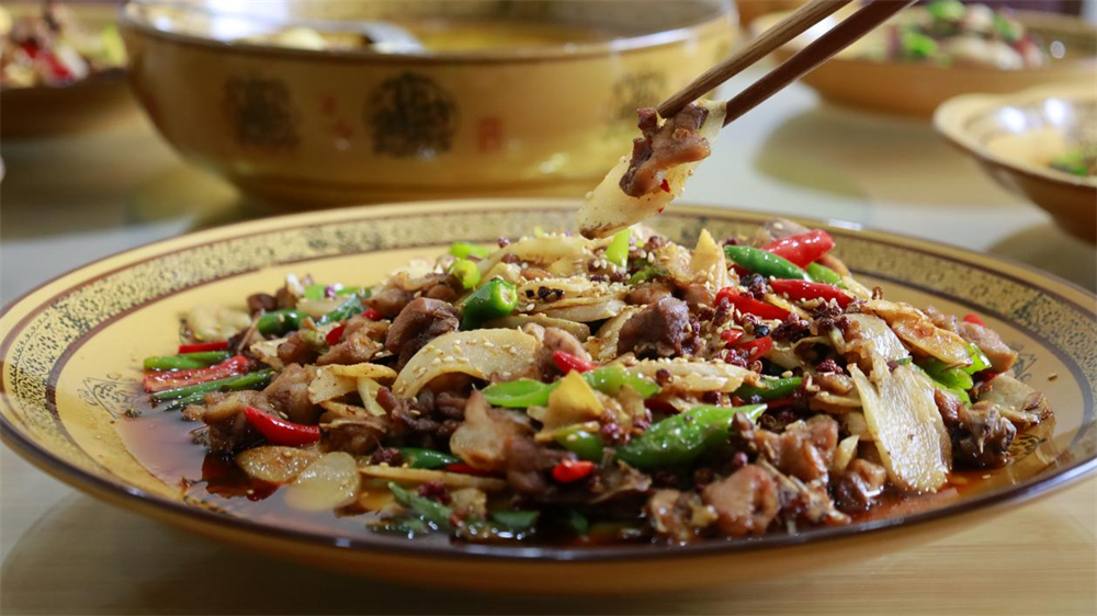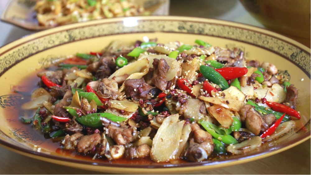 散养的鸡肉肉质紧实,仔姜片薄如蝉翼。食材准备就绪,铁锅烧至冒青烟,跑山鸡裹着琥珀色酱汁跃入锅中,瞬间激起一片噼啪爆响。仔姜的鲜、泡姜的酸、老姜的烈,与两种自制豆瓣酱在热油中狭路相逢。农场主李仲友的炒勺如指挥棒,将鸡肉与三味姜片翻炒成旋风,青红椒段是最后投入的彩色音符。