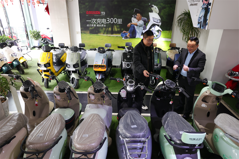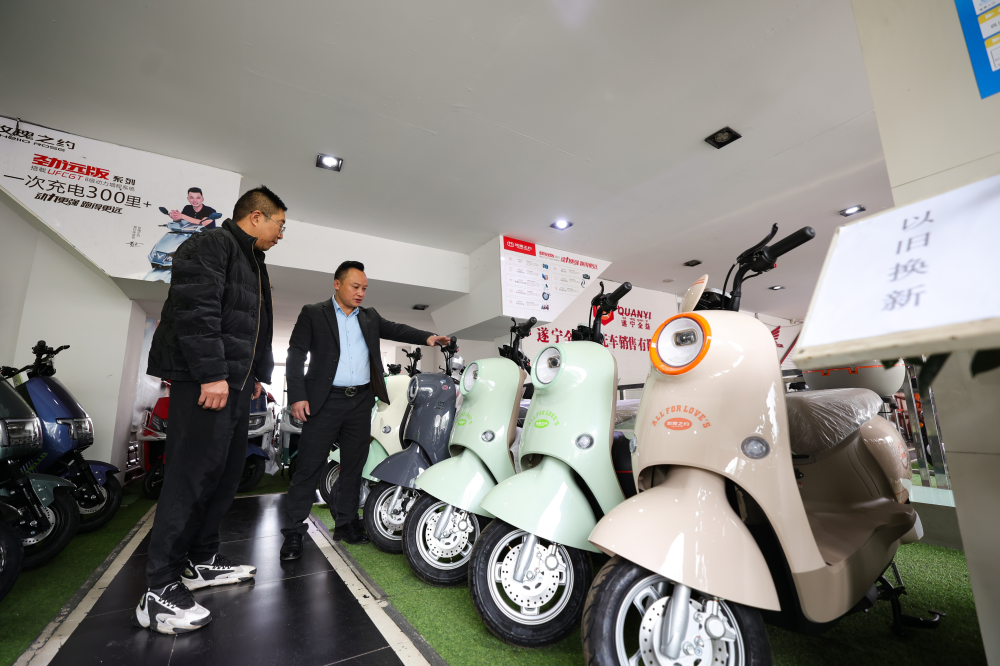 △在安居城区某电动自行车销售企业,销售人员正向市民介绍电动自行车“以旧换新”优惠政策