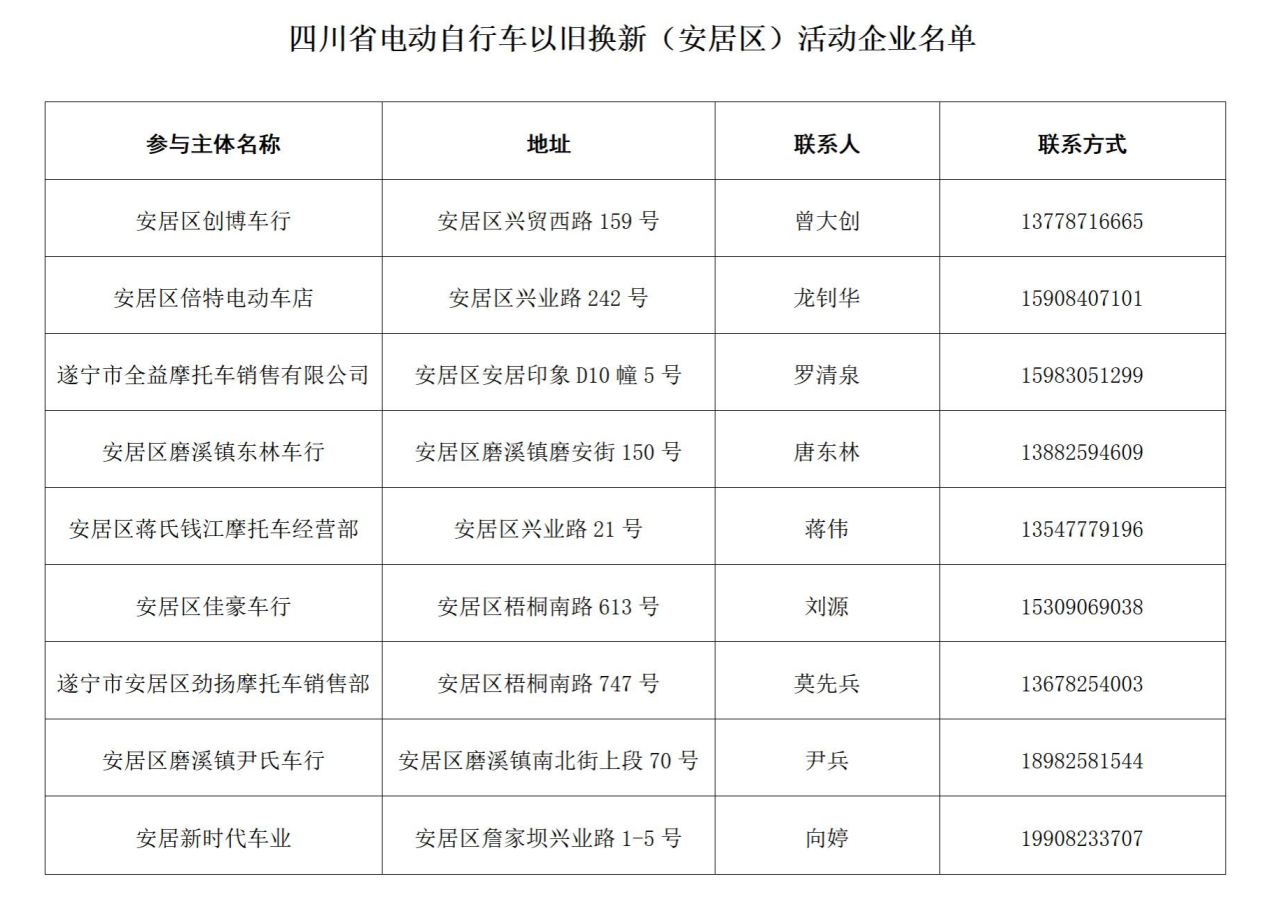 根据安居区商务局公布的信息显示,目前,安居区共有9家企业参与电动自行车“以旧换新”活动。