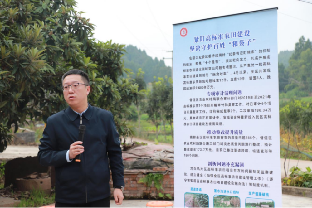 今年4月以来,安居区纪委监委扎实开展高标准农田建设领域突出问题专项整治,发现问题线索12件,立案12件,留置3人,挽回经济损失600余万元。将案件查办与堵塞漏洞、建章立制结合起来,做实边查、边改、边治,并召开坝坝会,邀请群众现场评议整改情况,收集群众反映问题,切实推动责任部门将高标准农田建成群众“舒心田”。