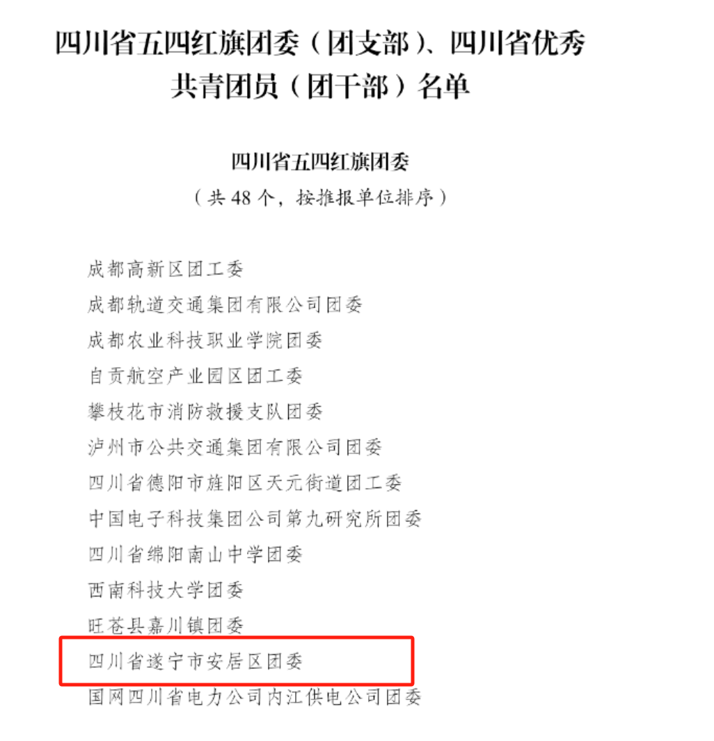 2023年,在成立在成立县级青年联合会、建成川渝青少年综合实践基地等方面实现了4个全省首次,西部计划、青年突击队、“青马工程”等6项工作被团中央、团省委点赞、肯定和表彰。全区共青团系统中有4个单位荣获国家级表彰,4个集体、19人荣获省级表彰,13个集体、47人荣获市级表彰,全面展现了共青团组织、团员青年的青春风采,赢得了社会各界对共青团工作的认可,在省市共青团系统内逐步实现了有影响、有口碑、有品牌。