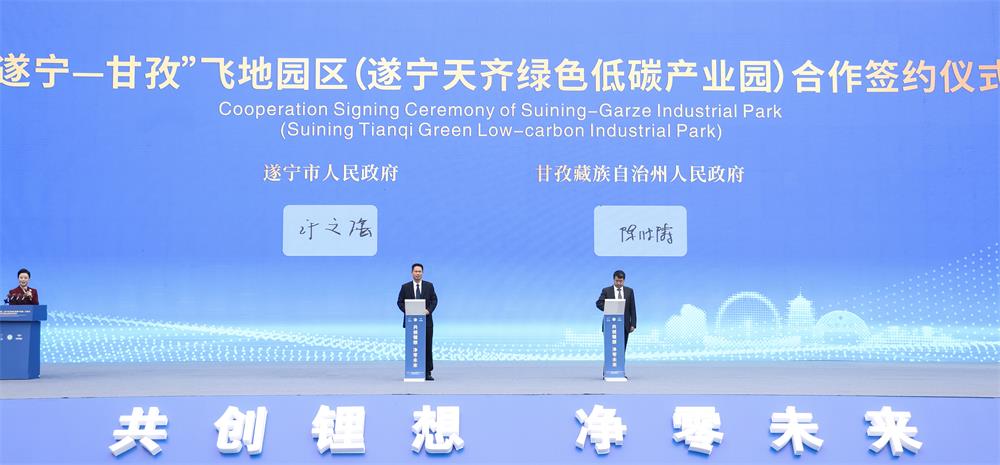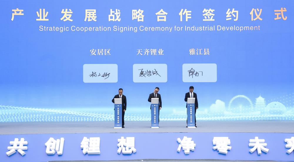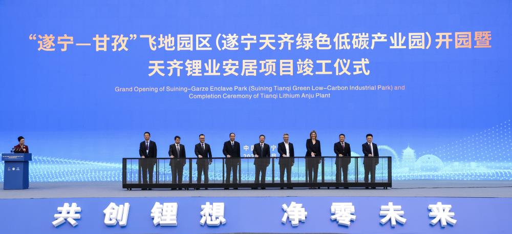 仪式上,遂宁市人民政府和甘孜藏族自治州人民政府签订了共建“遂宁—甘孜”飞地园区合作协议;安居区与雅江县、天齐锂业股份有限公司签订了安居区、雅江县、天齐锂业产业发展战略合作协议;与会领导还共同为“遂宁—甘孜”飞地园区揭牌。竣工仪式前,与会领导和嘉宾参观了天齐锂业安居项目运行情况。