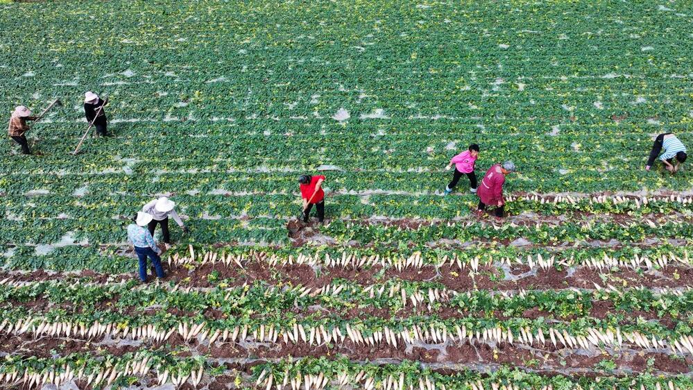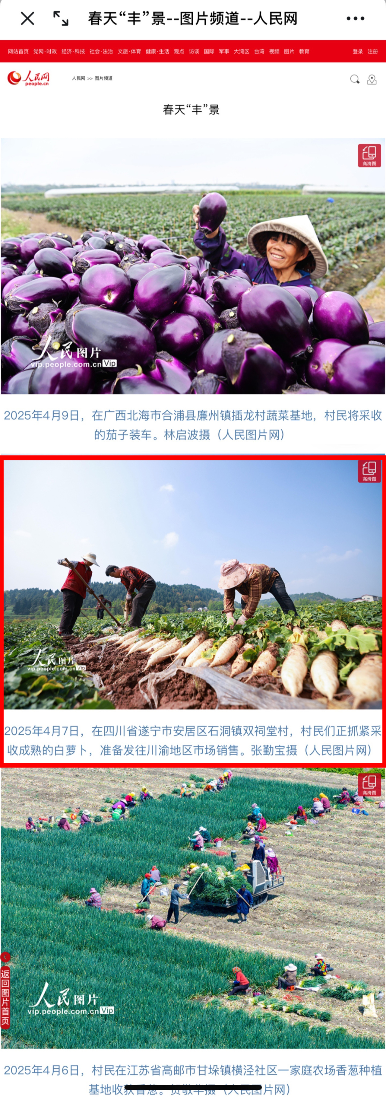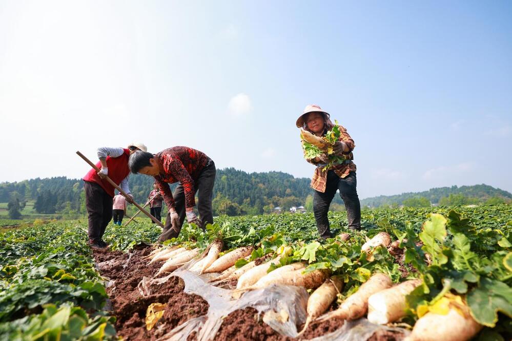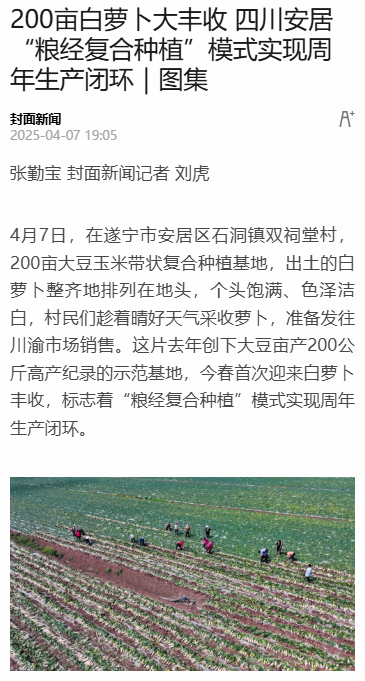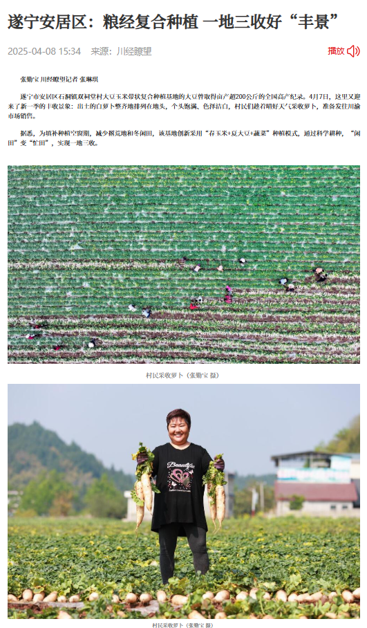 遂宁市安居区石洞镇双祠堂村大豆玉米带状复合种植基地的大豆曾取得亩产超200公斤的全国高产纪录。4月7日,这里又迎来了新一季的丰收景象:出土的白萝卜整齐地排列在地头,个头饱满、色泽洁白,村民们趁着晴好天气采收萝卜,准备发往川渝市场销售。