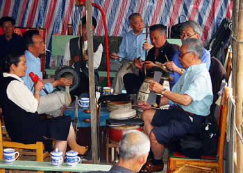 打围鼓。打围鼓又称"玩友"。工余饭后或红白喜事,邀请四五"玩友" 围坐一起清唱。不用舞台、化妆和服装,一般在玩坝或茶馆举行。玩友各自坐在座位上,手执板鼓、堂鼓、川鼓、马锣、川胡、钹之类乐器,自吹自打自唱。打板鼓者是鼓师,其他乐器以鼓师手势、鼓签、鼓点指挥行事。打围鼓花钱不多,费事不大,因而深入民间,广泛流传,满足了川剧爱好者爱唱、爱听的要求。